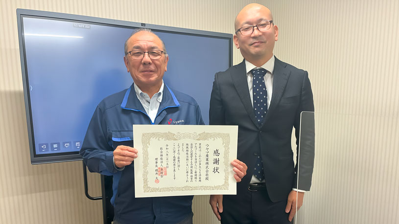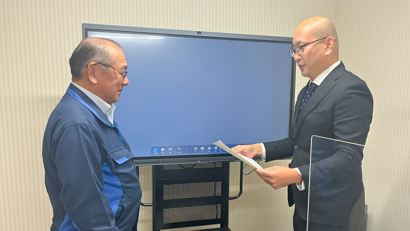 宇山代表取締役社長より「来社いただきありがとうございました。社会福祉法人秀峰会 理事長 櫻井様からの感謝状をいただき、大変恐縮しております。本件は社内報を通じて従業員にも報告したいと思います。」とのお言葉も頂戴しました。