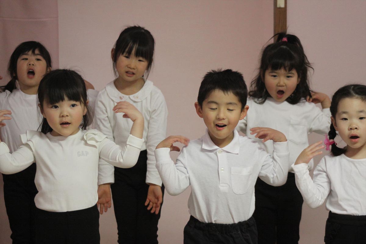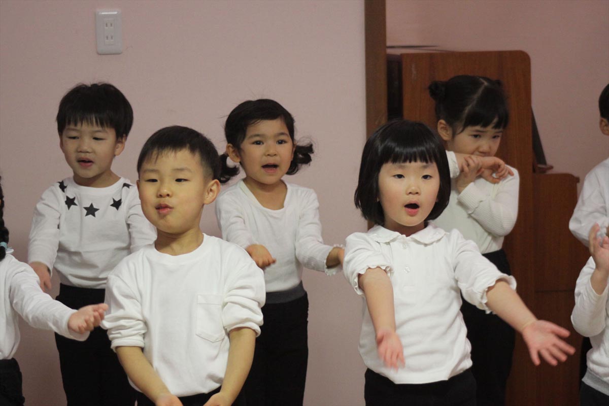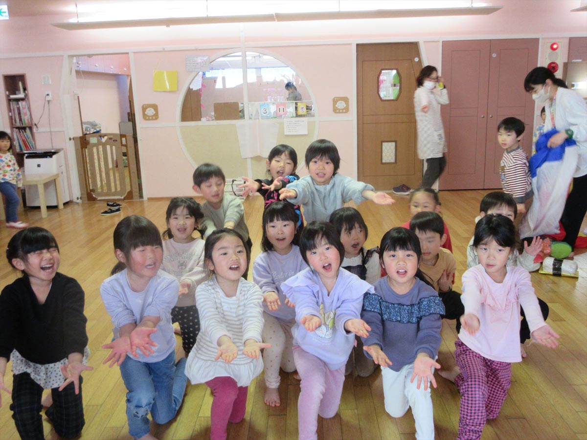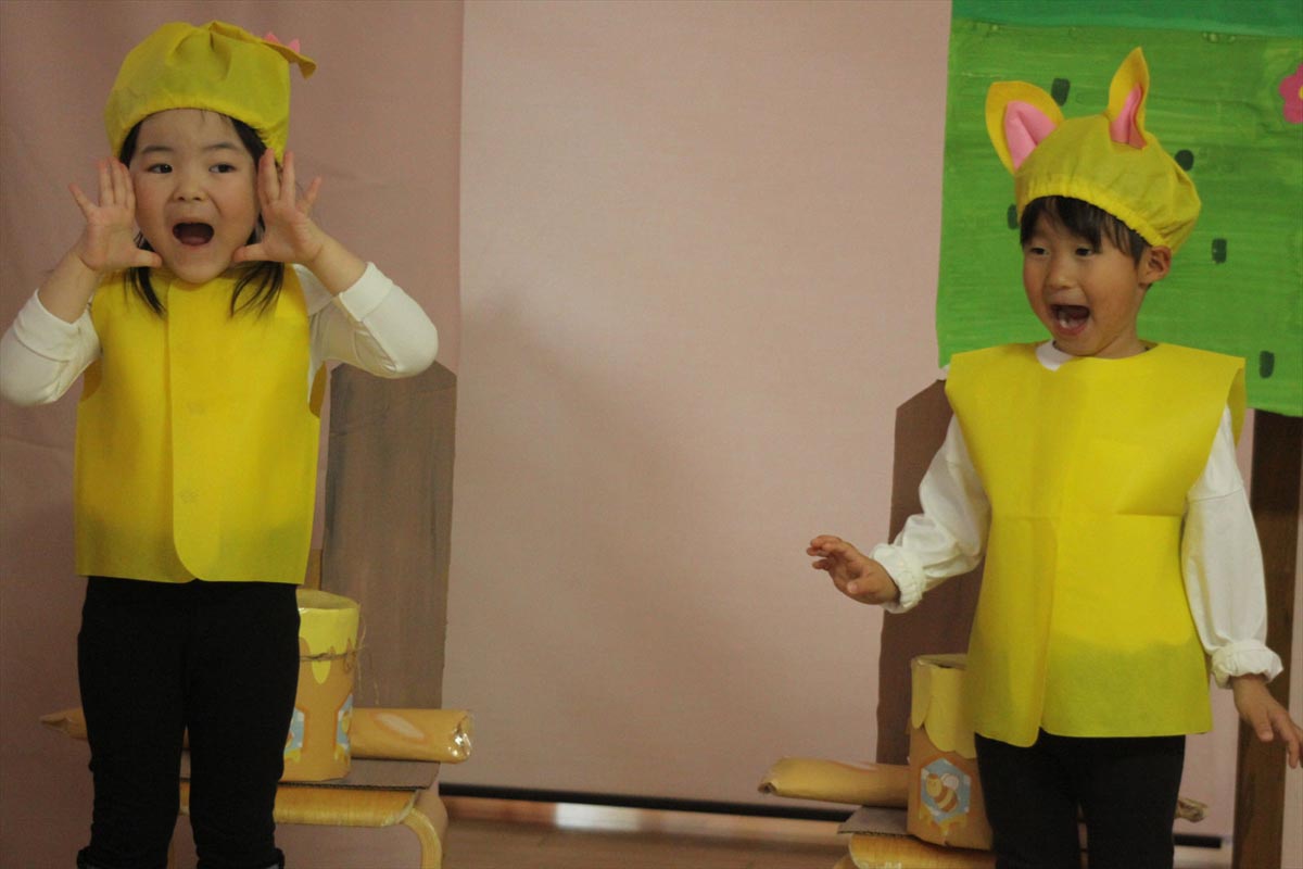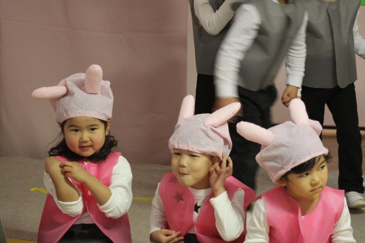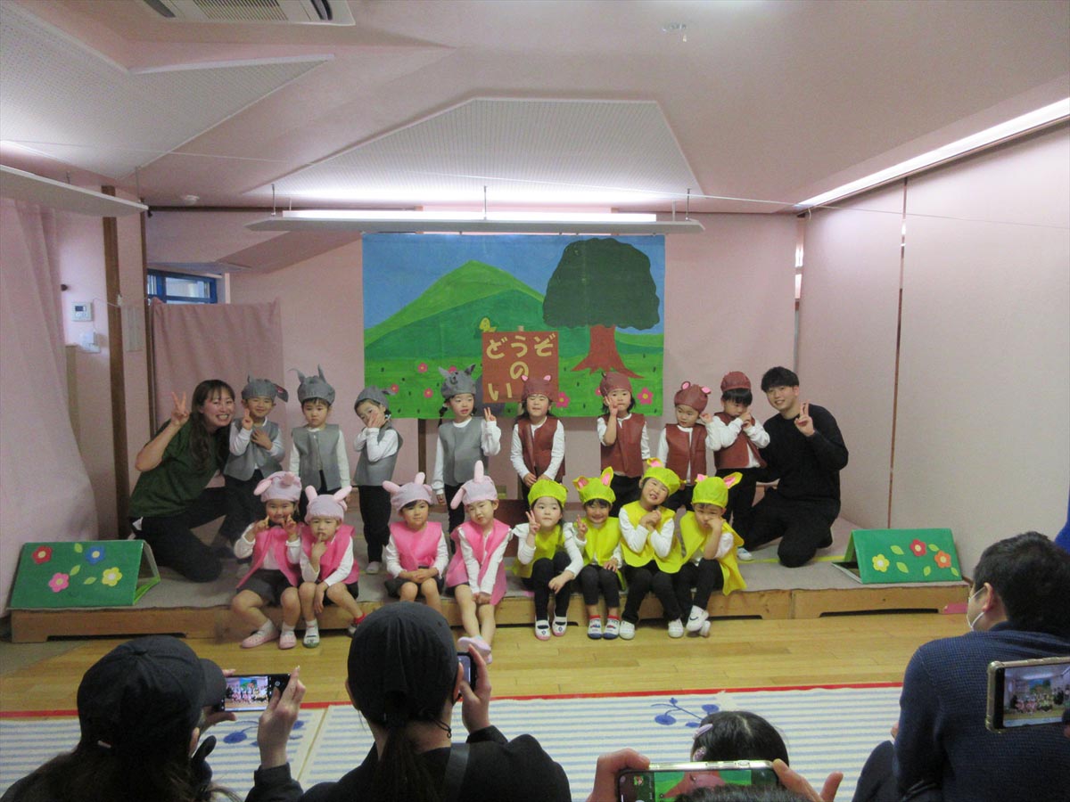 3歳児こあら組は、毎週行うリズムの時間に取り組んでいる“ハンドサイン”と、子どもたちのリクエストで決めた♪にじのむこうに♪の歌、そして大好きな絵本の『どうぞのいす』のオペレッタを披露しました。