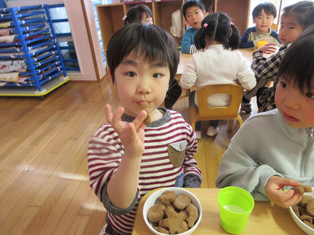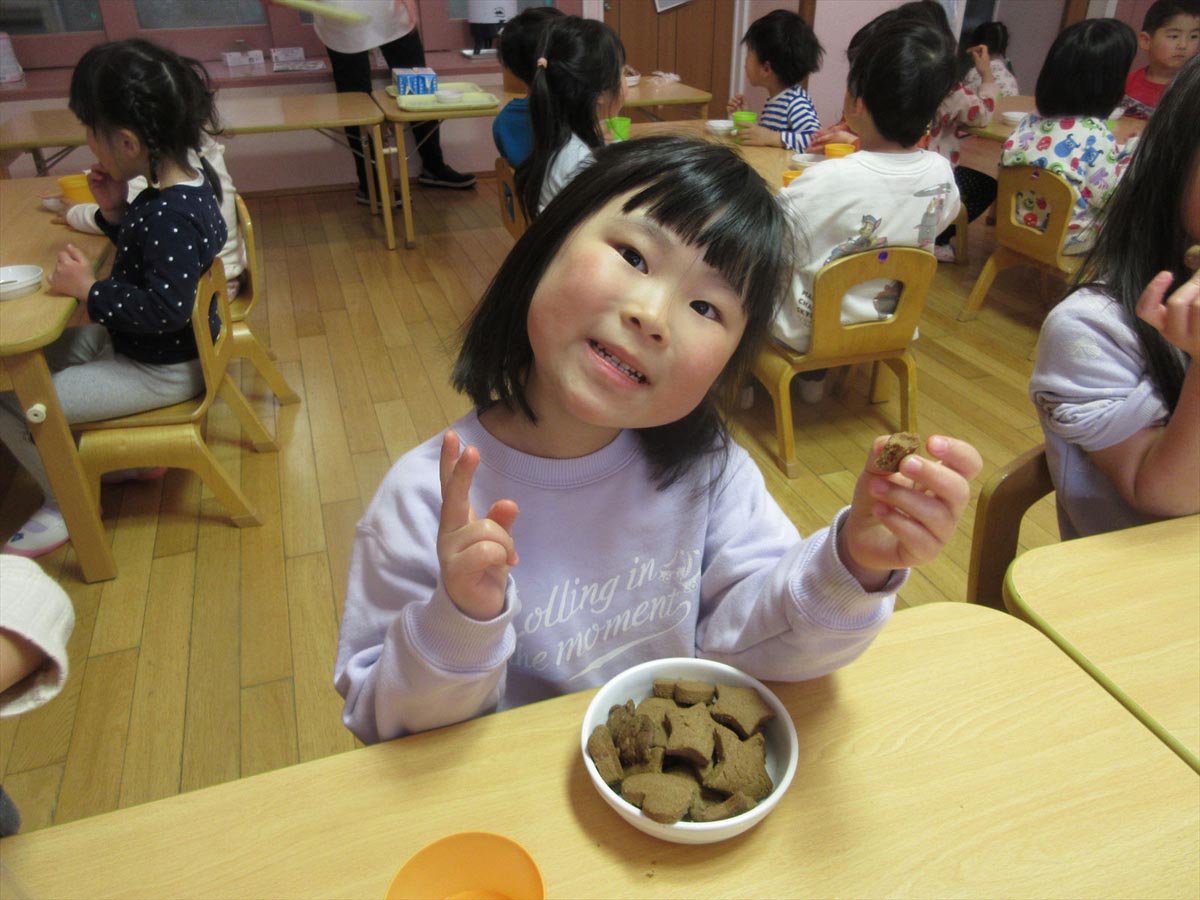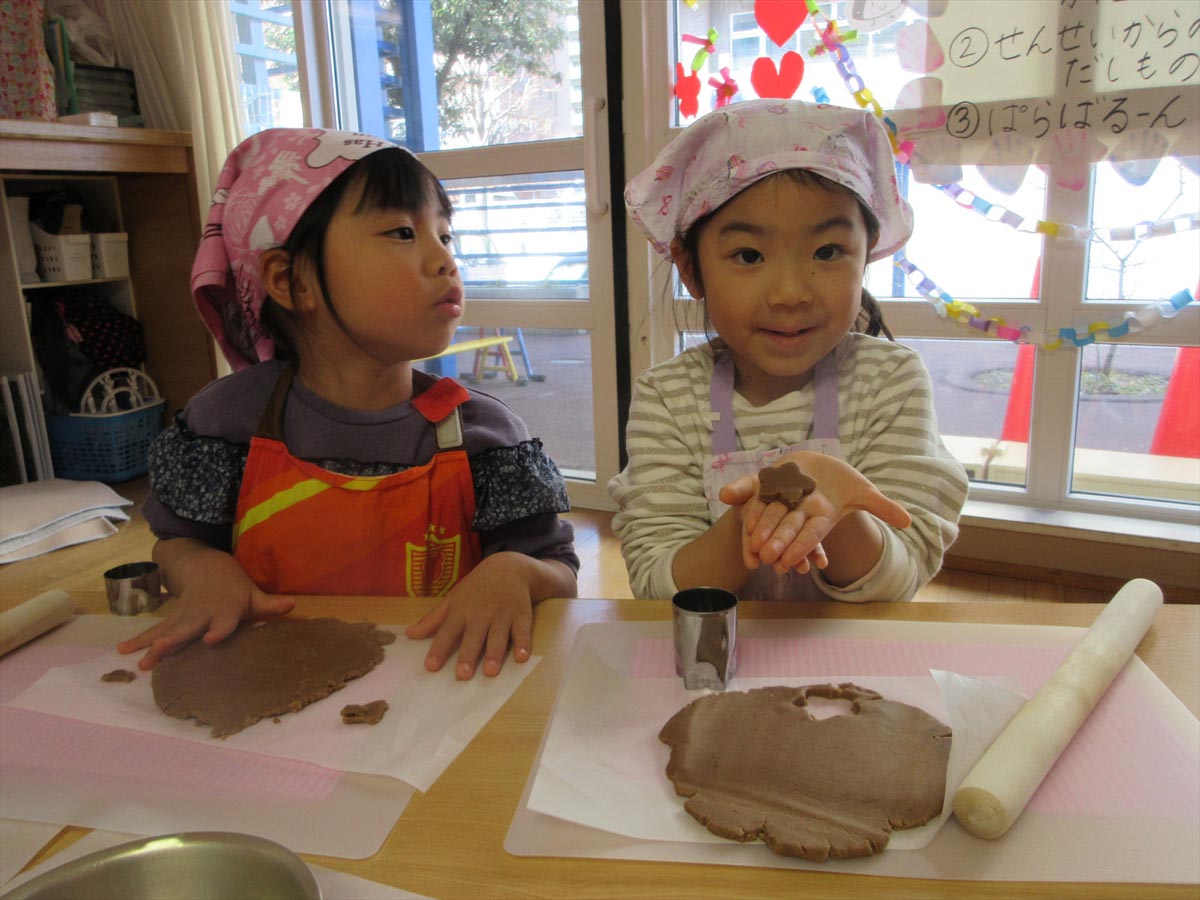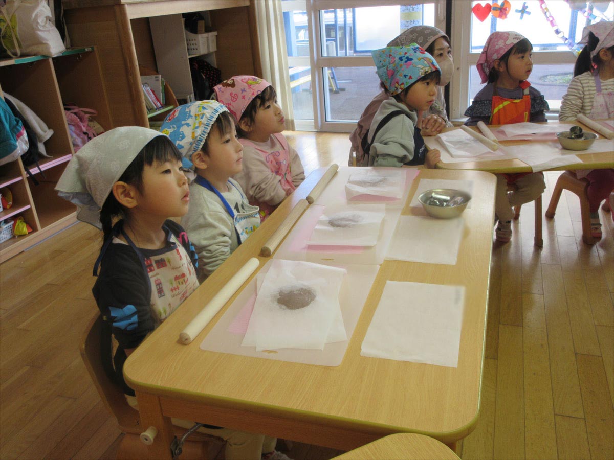 おやつの「ちんすこう」の型抜きに挑戦しました。「早くやりたーい!」でも逸る気持ちを抑えて調理員さんの説明をしっかり聞きます。