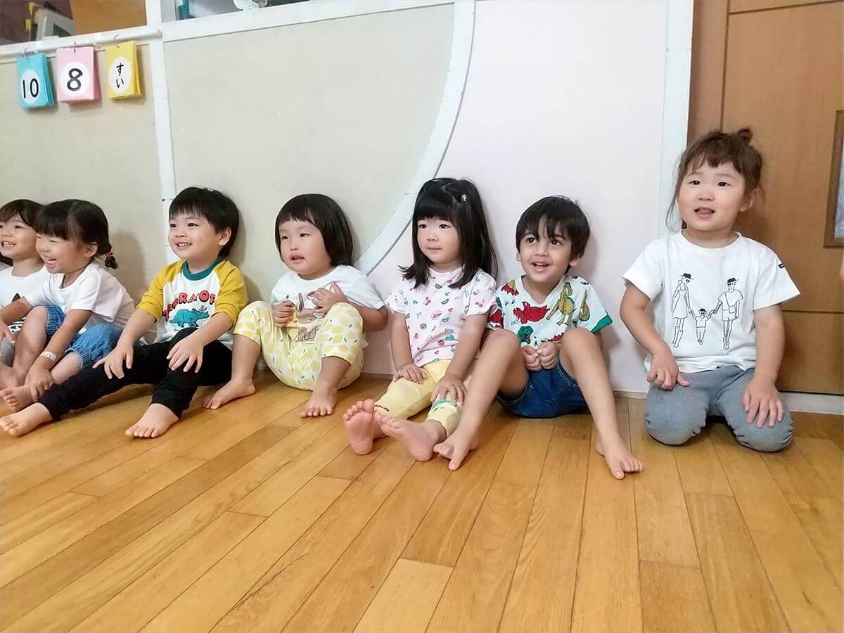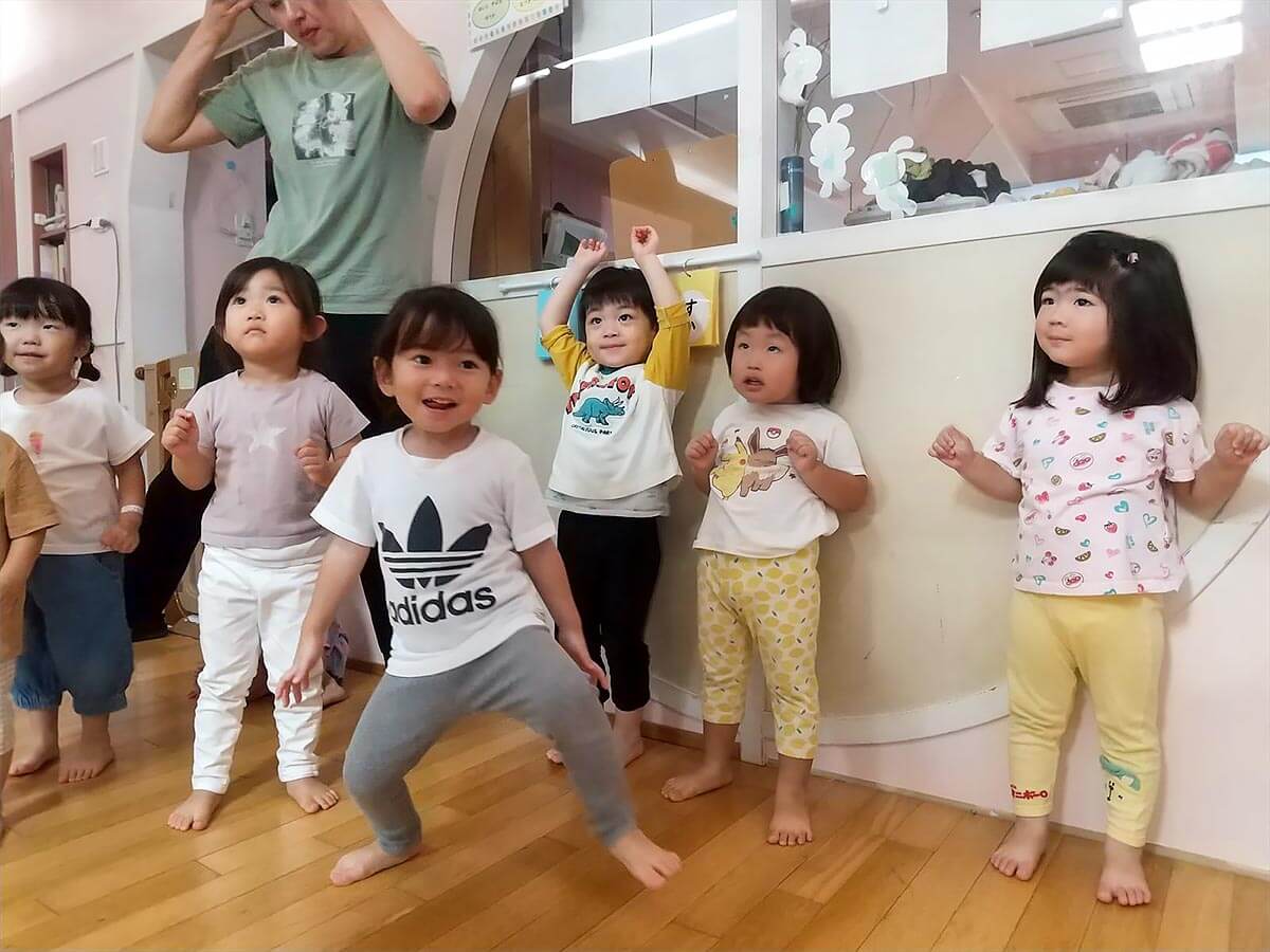 身体を動かすことが大好きなりす組さん。今日は待ちに待った体操指導の日。「体操がはじまるよ~!」と、伝えると大喜び。まずは準備体操。ジャンプ!ジャンプ!
