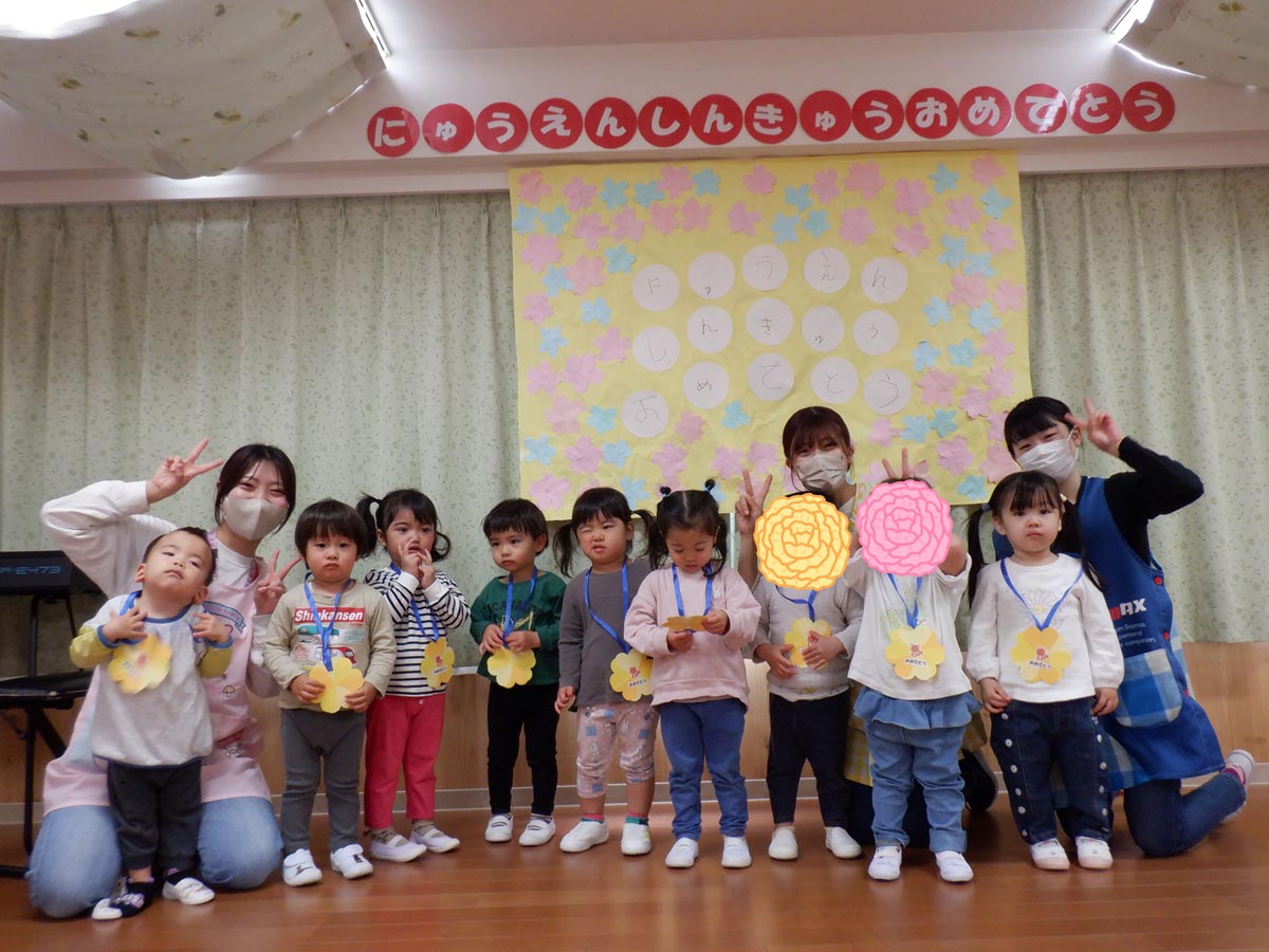ひよこぐみ、うさぎぐみ、りすぐみ、こあらぐみに新しい仲間が増えました。こぐま組のお兄さん、お姉さんとのお別れで、少し寂しかった保育園が、また賑やかになりました。新しいおともだちの入園と、お兄さんお姉さんになったお祝いの会を致しました。メダルを胸にみんなの誇らしげなお顔が素敵でした🌸
