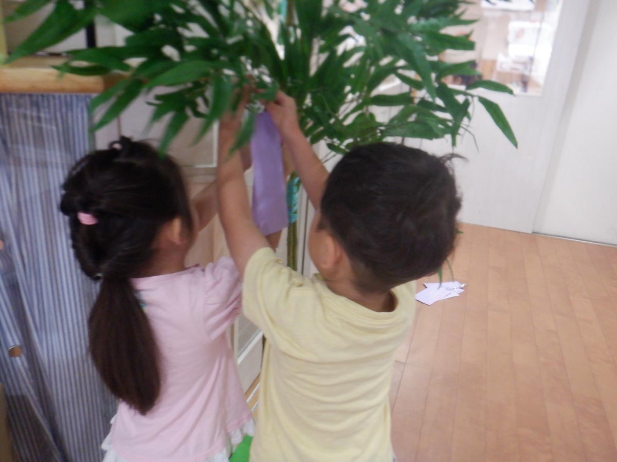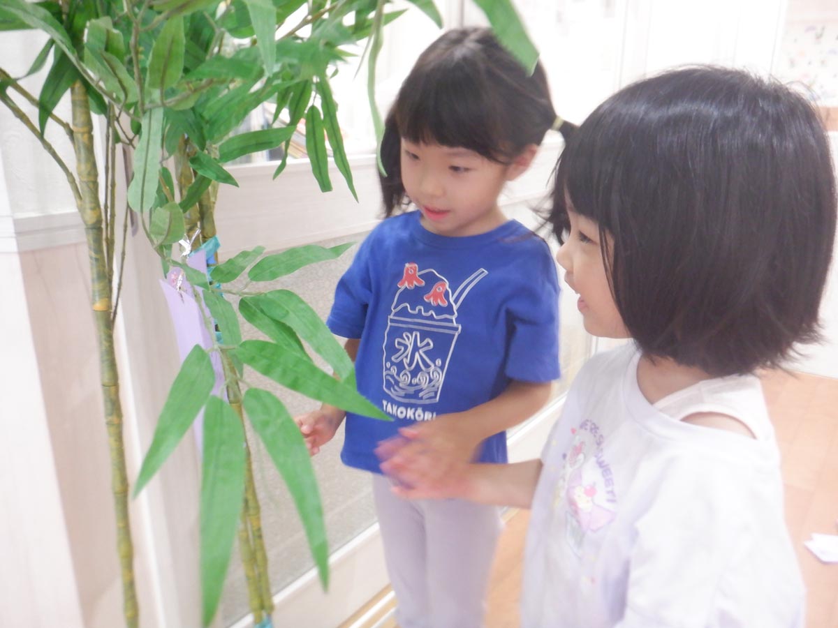 子どもたち一人ひとりの願い事を書いた短冊と織姫や彦星、お星さまなど七夕飾りを笹の葉や壁に飾りました。とても綺麗で賑やかになりました。