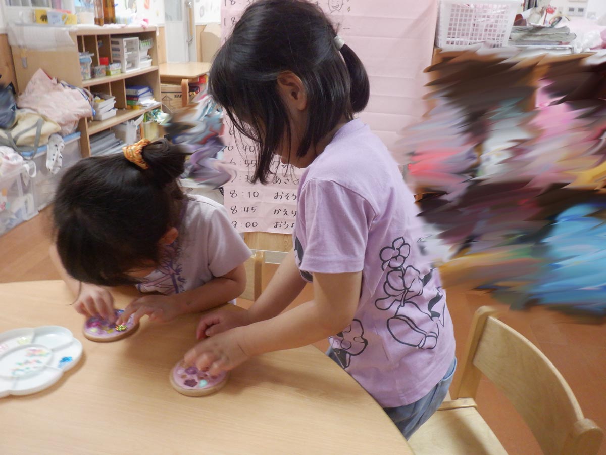 コースターの土台に紙粘土をつけビーズを飾り付け、絵の具で好きな色を塗りました。完成したコースターは夕ご飯の時に使いました💖