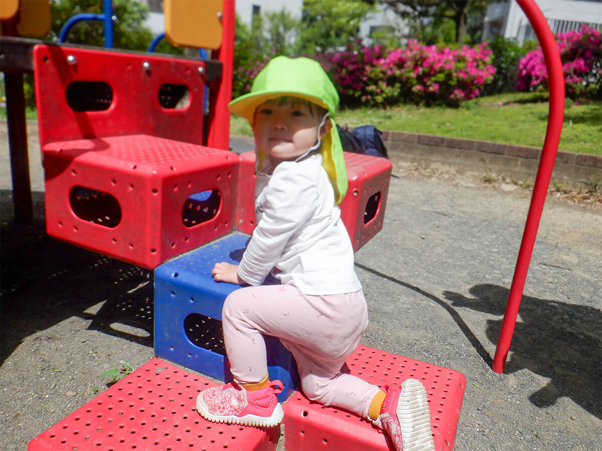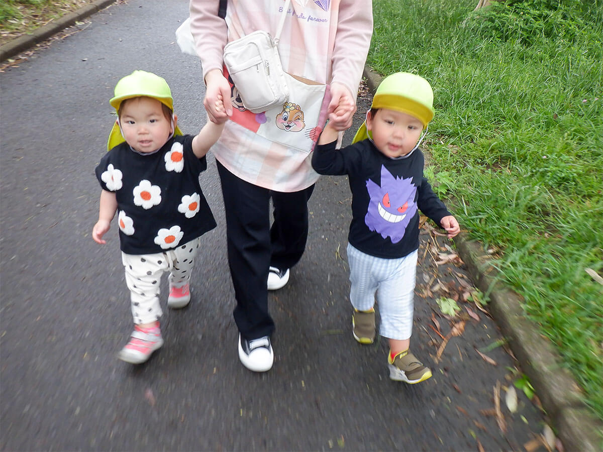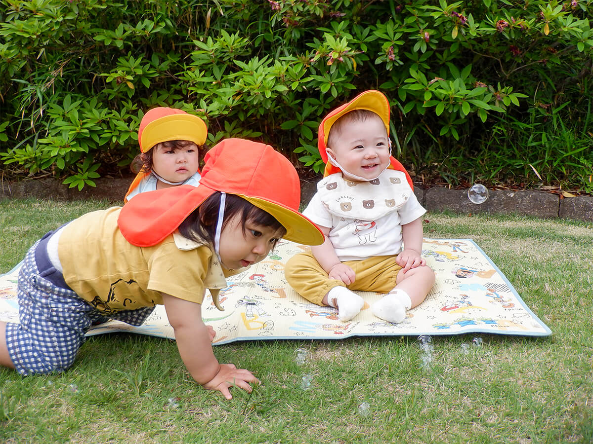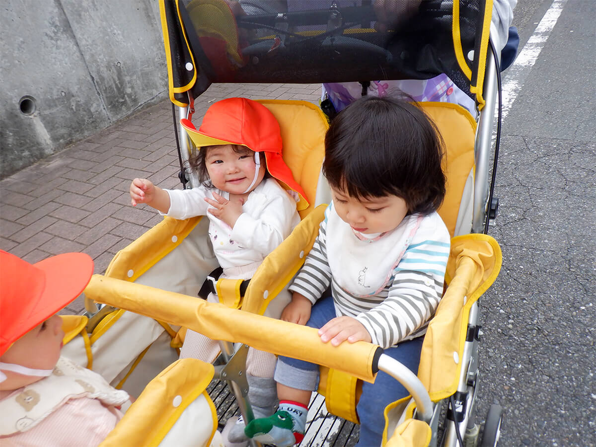 初めての場所や保育士にも慣れてきたひよこ組のお友達!お散歩に行く事が大好きで、いつもバギーに乗ると嬉しそうにニコニコしながらお外を眺めたりしています♪