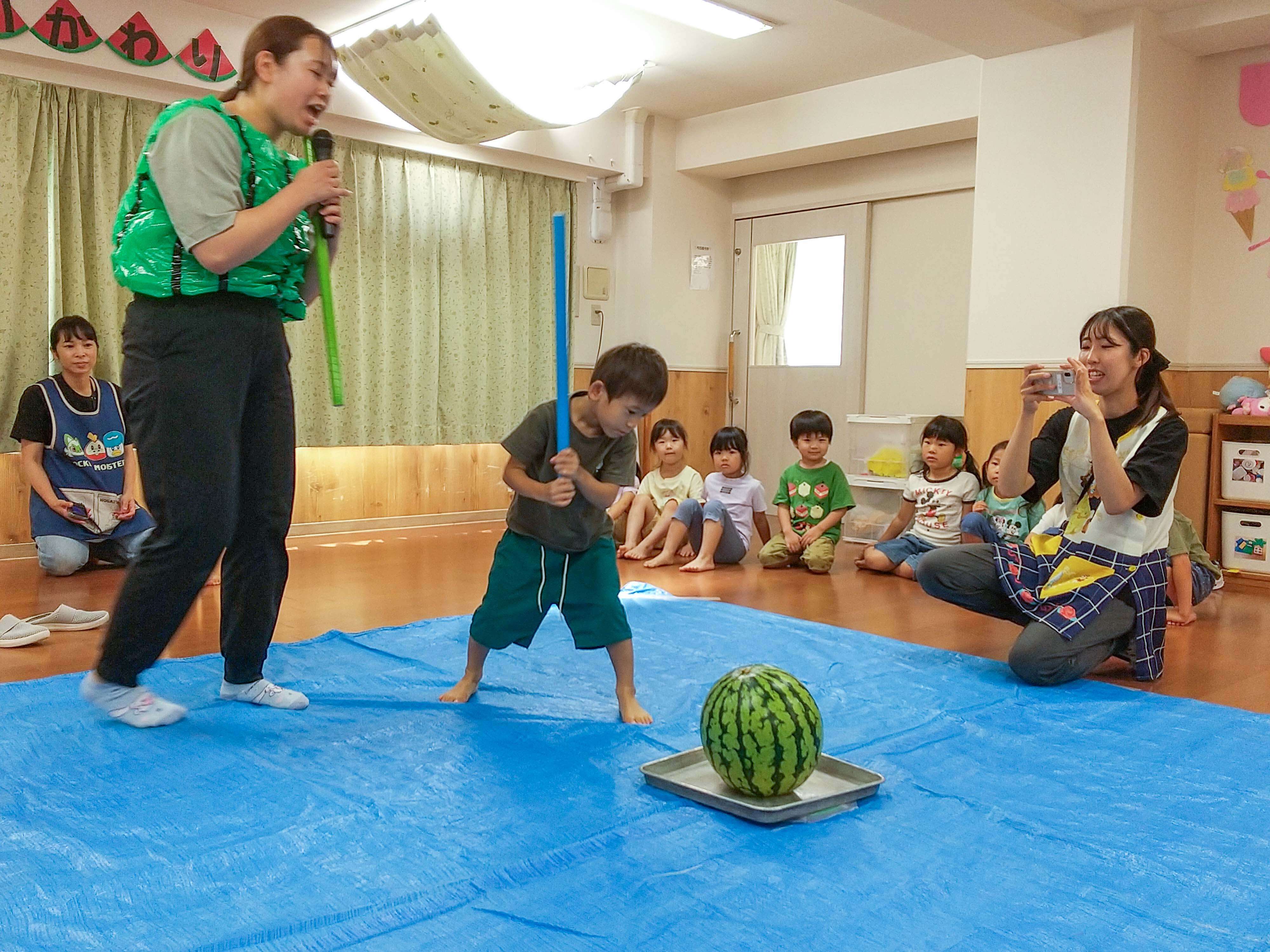 ひよこ・うさぎ組のお友だちは小玉すいかに触れたり、中身を見て興味深々な様子。りす・こあら・こやぎ・こぐま組のお友だちは大きなすいかを一人ずつ叩いていざ、すいかわりスタートです!!