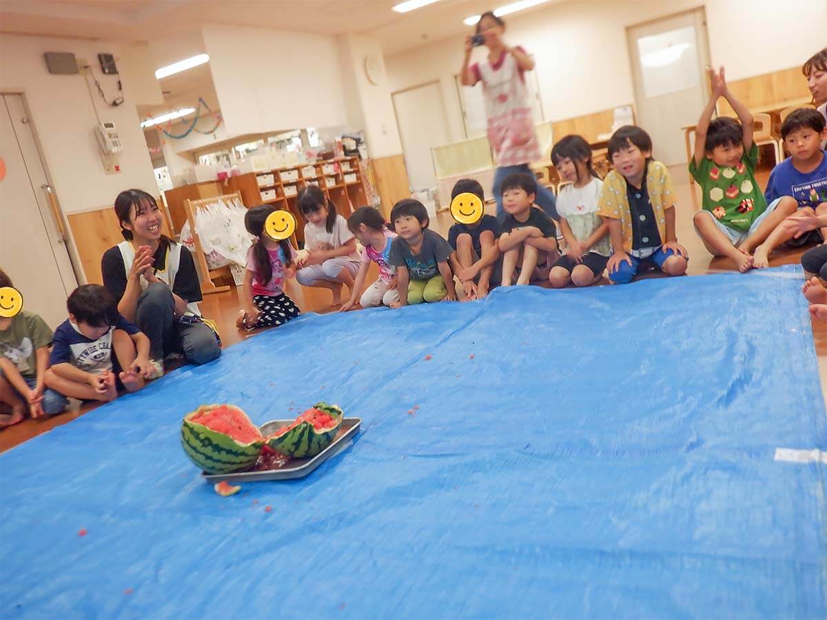 やったー!と大喜びの子どもたち😊割れたすいかを眺めながら、「すいかから汁が沢山出てる!」「いい匂いがするね!」と感じたことを口々に話していました。