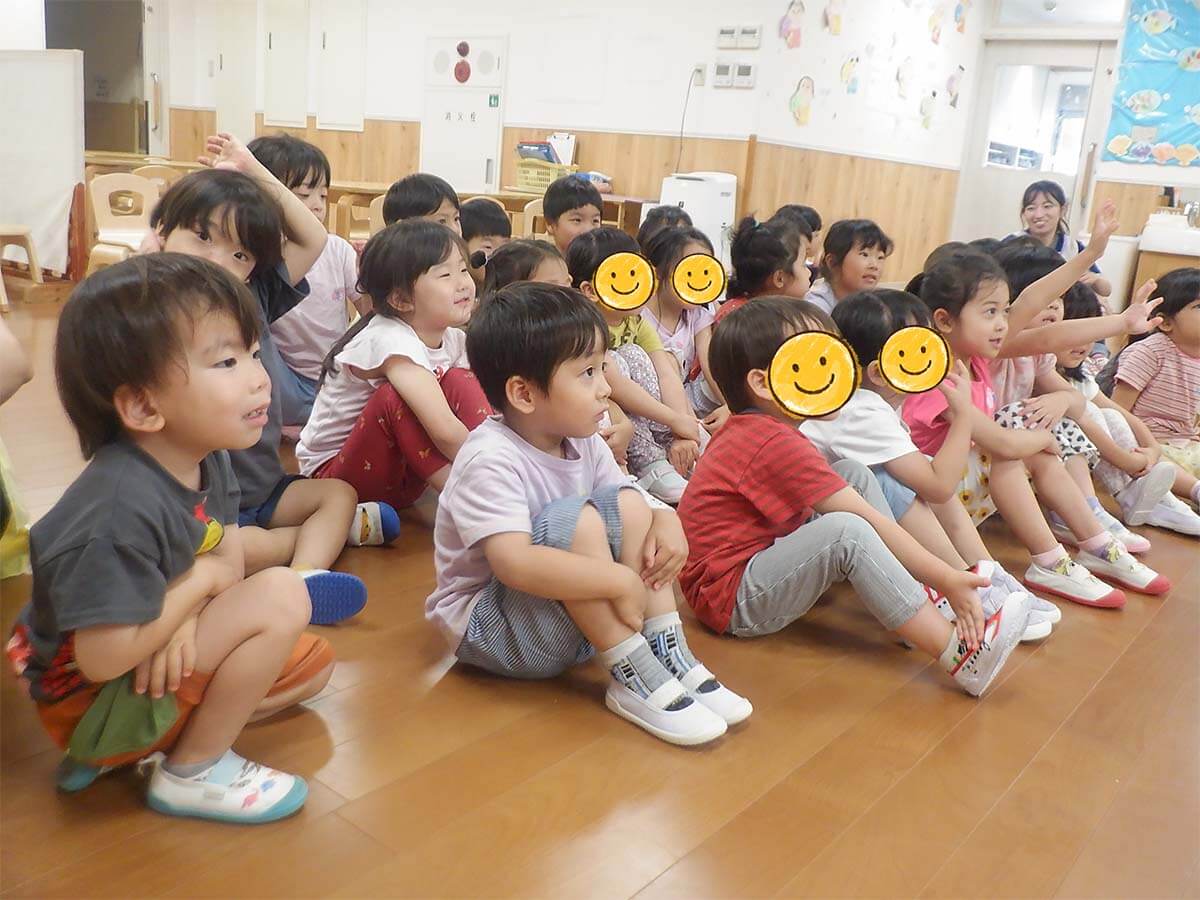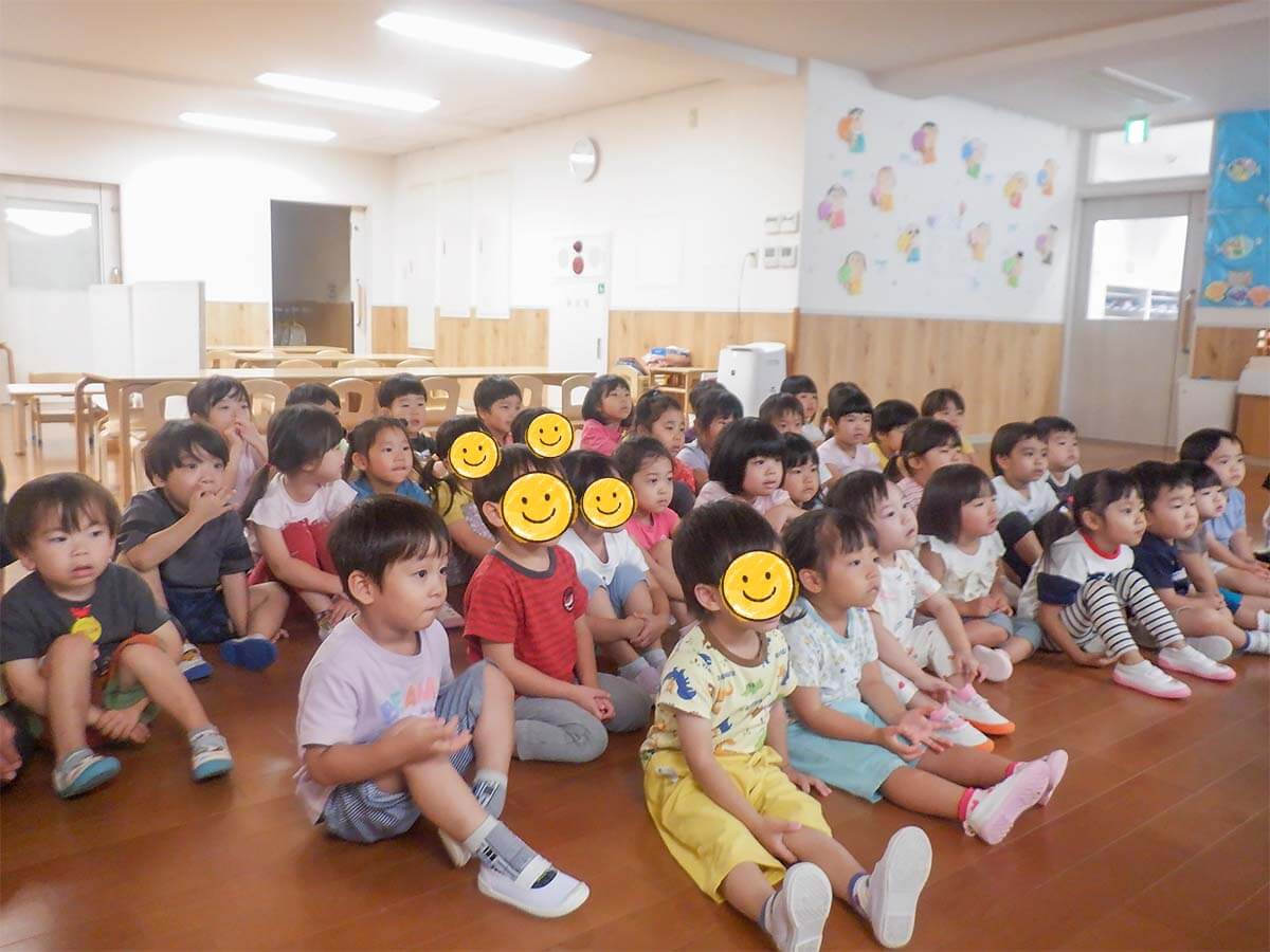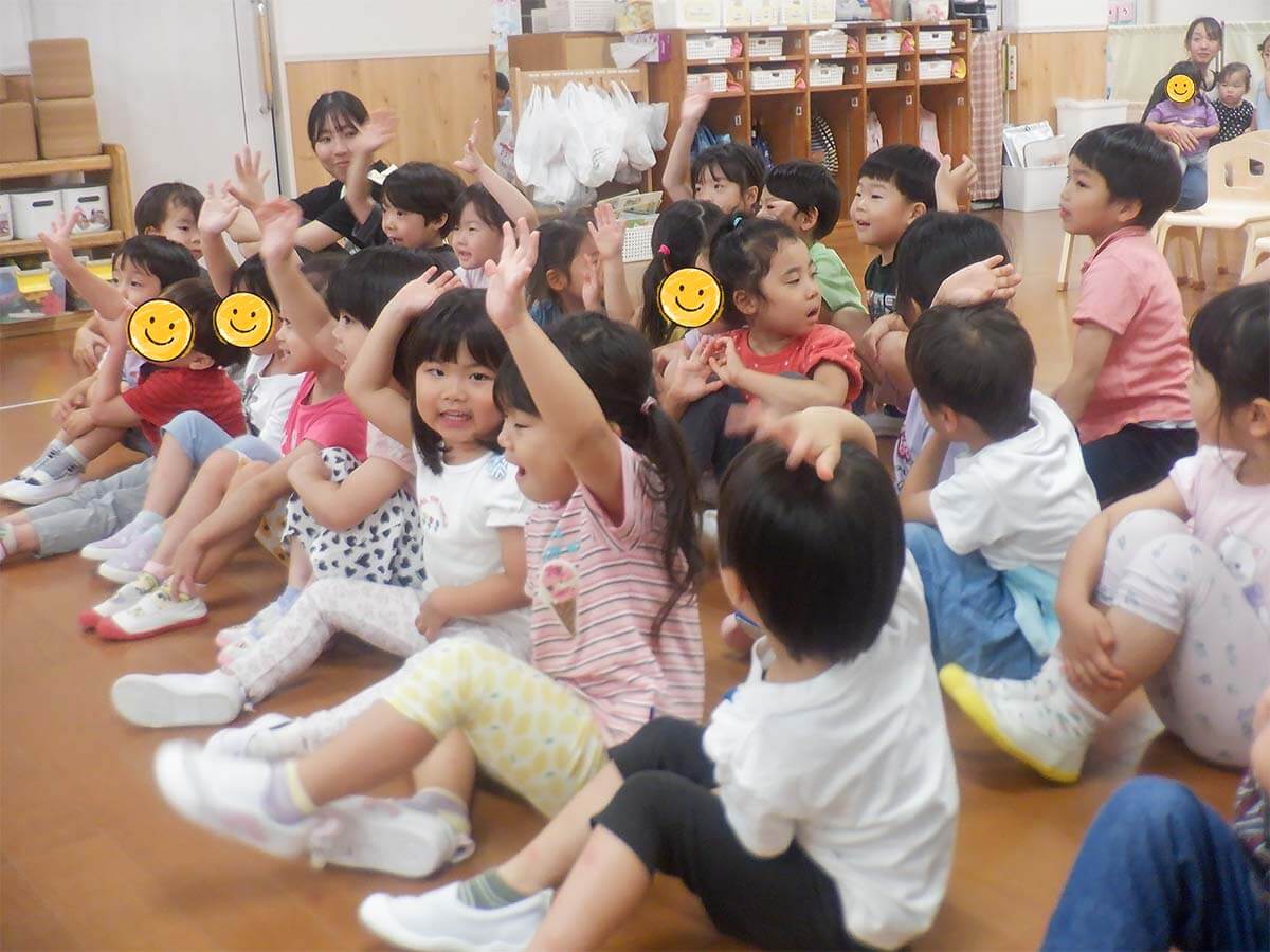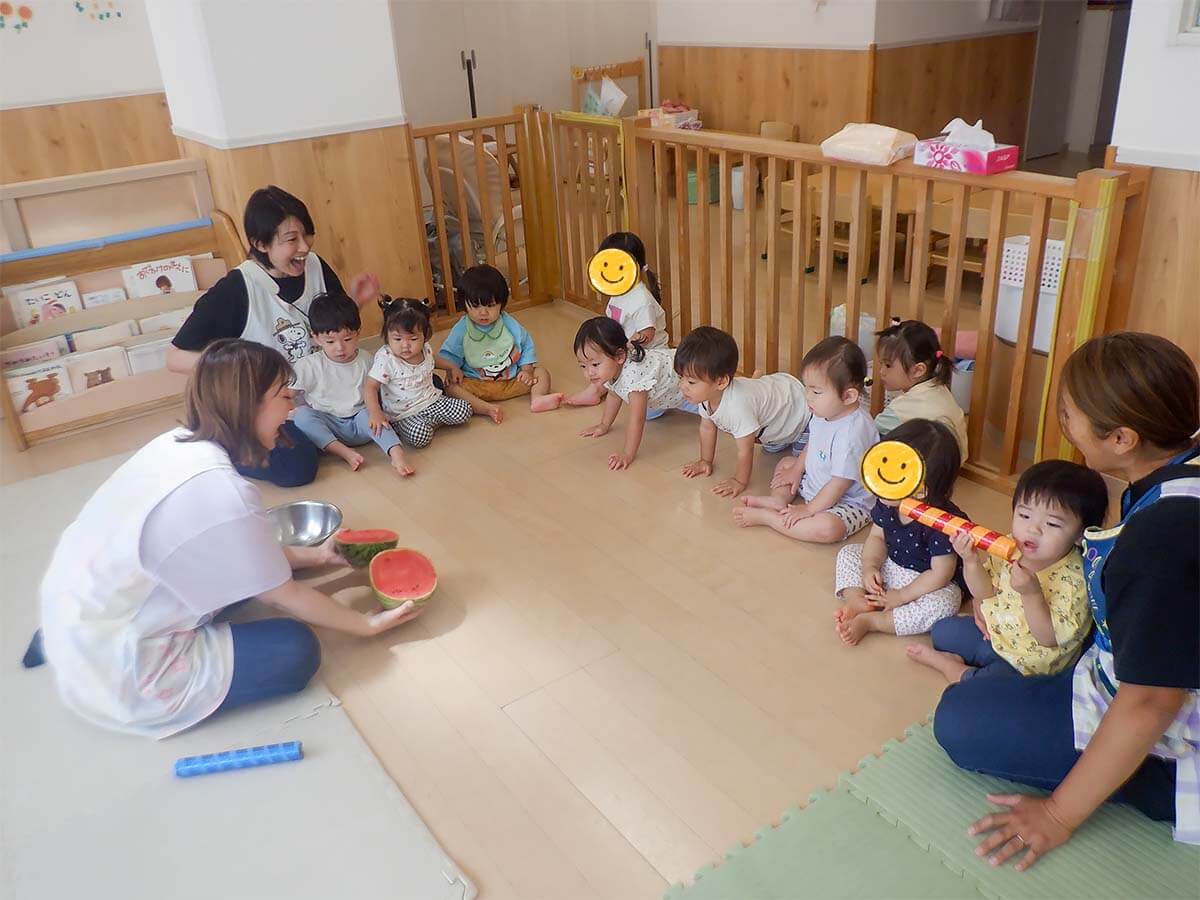 始めにすいかわりの由来を伝え、その後、みんなで元気に“すいかの名産地”の歌を歌いました🎵歌詞に合わせた振り付けも子どもたちで考え、歌に合わせて楽しく踊ることが出来ました😊