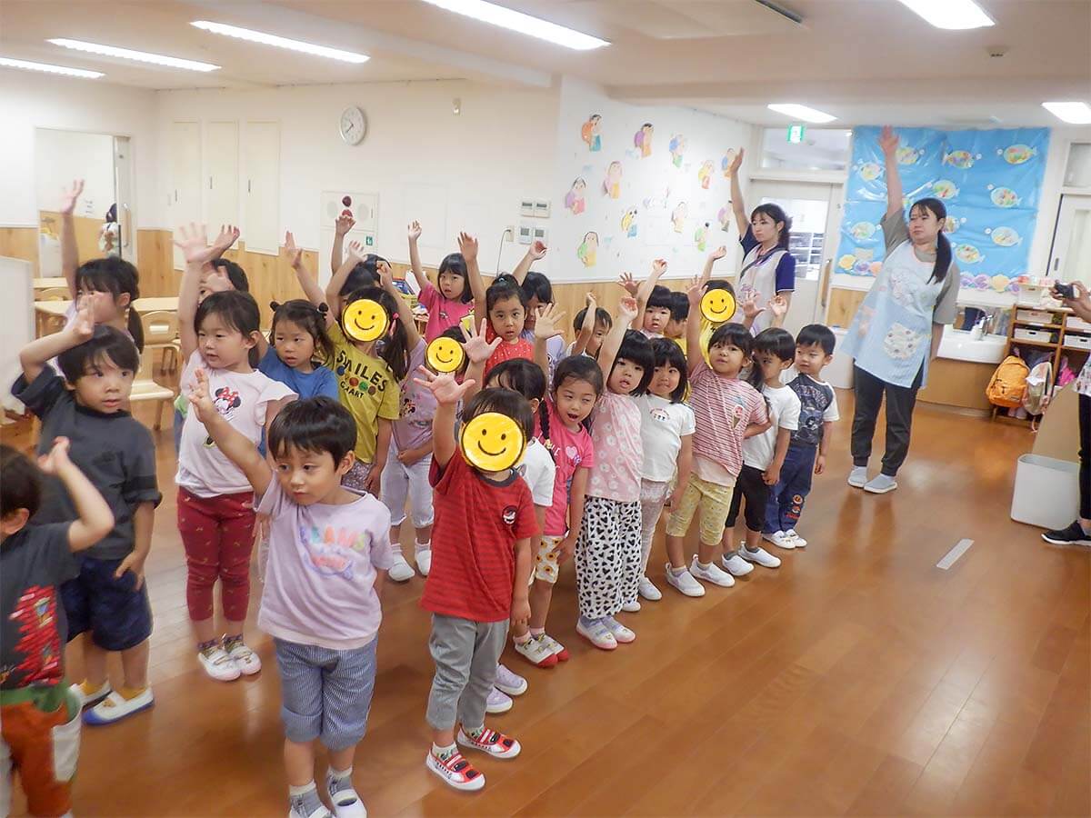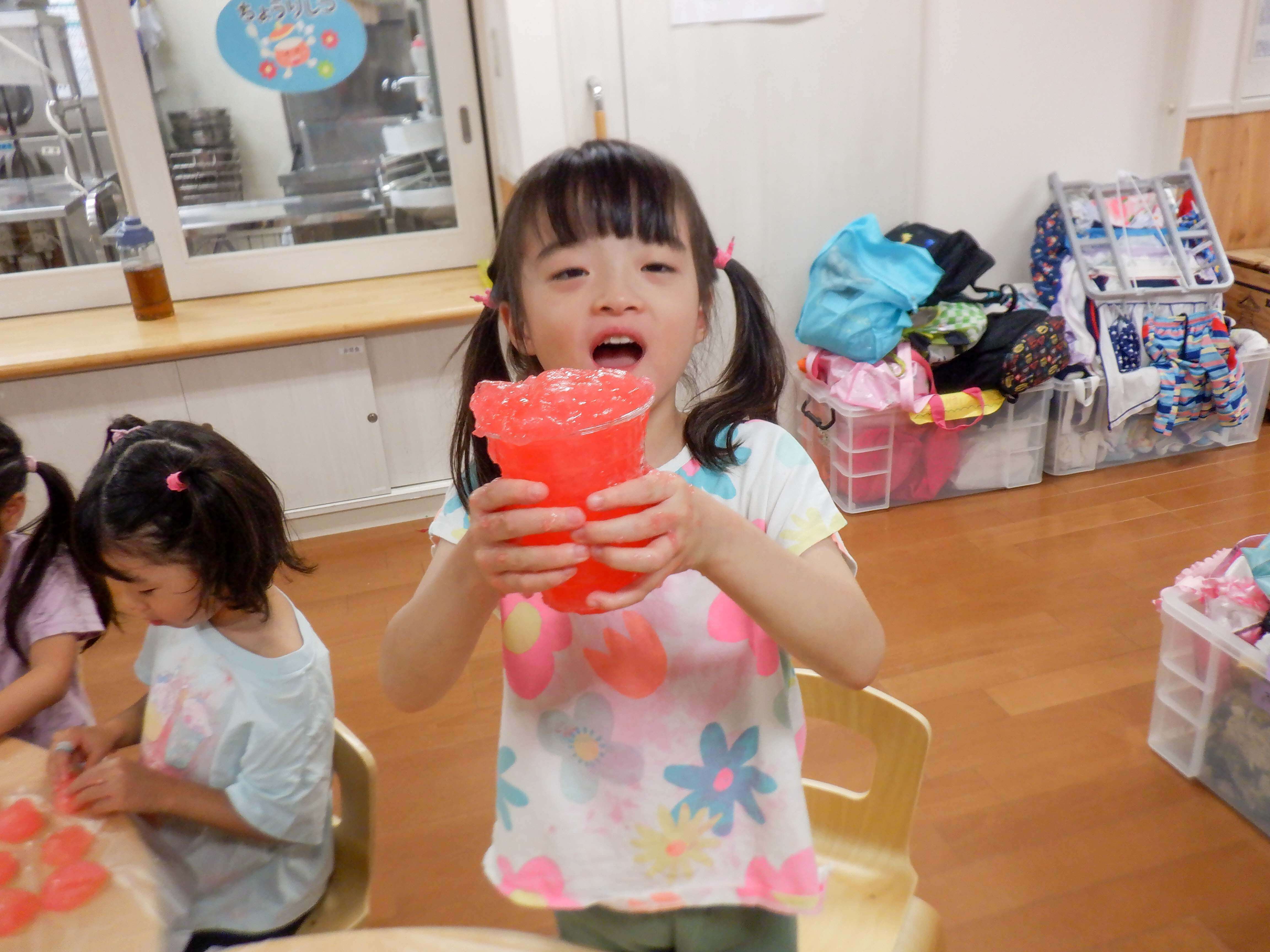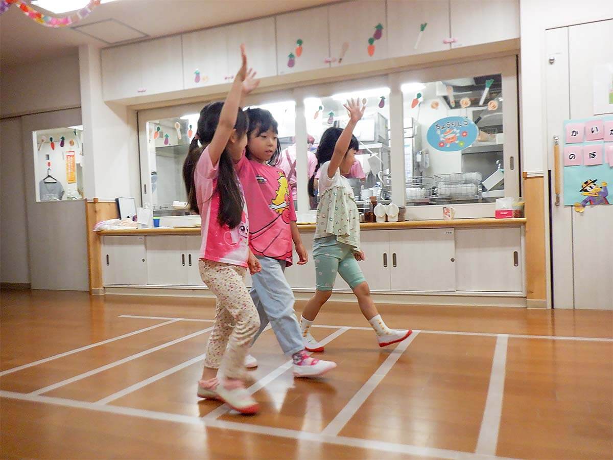 始めにすいかわりの由来を伝え、その後、みんなで元気に“すいかの名産地”の歌を歌いました🎵歌詞に合わせた振り付けも子どもたちで考え、歌に合わせて楽しく踊ることが出来ました😊
