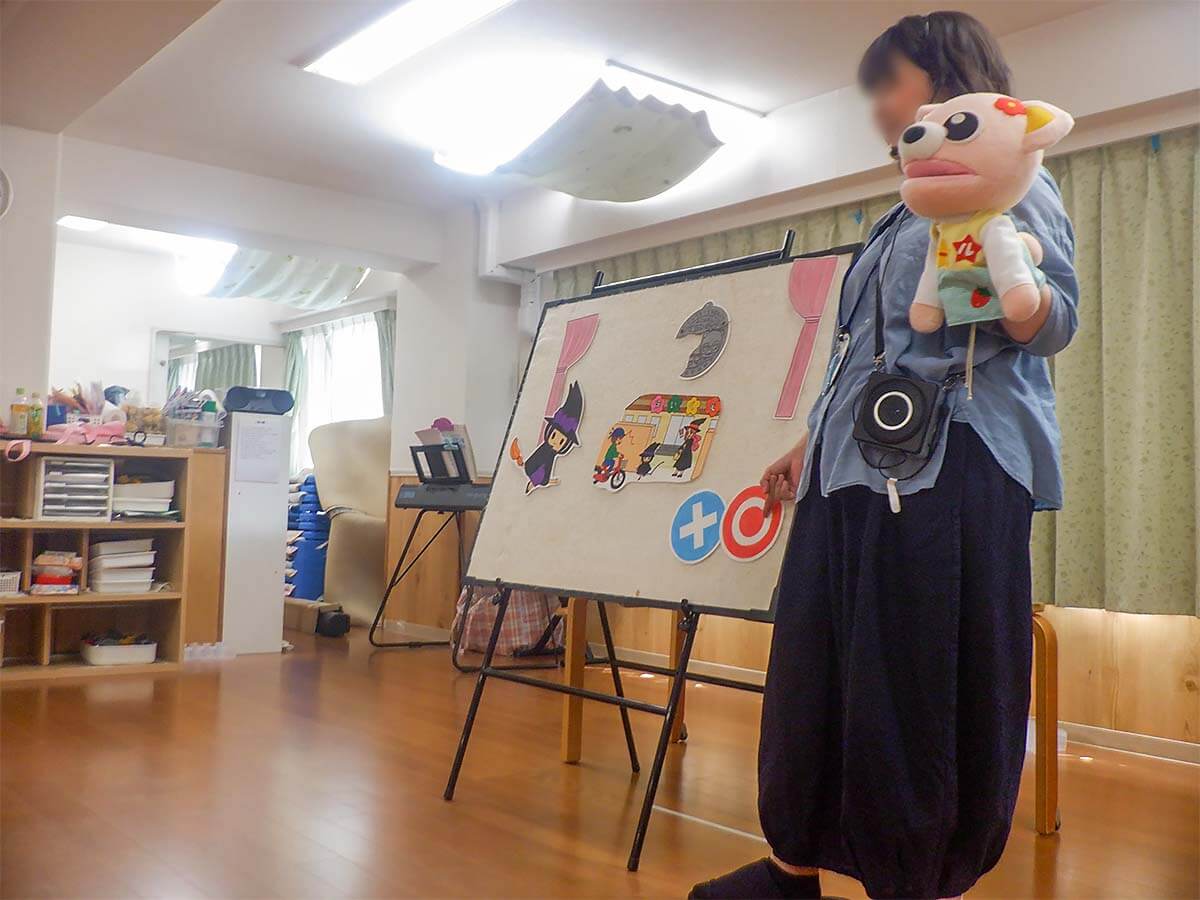 ペープサートやパネルシアターを使用しながら、交通ルールについて分かりやすく教えてくれました。 事前に、交通安全についての動画を見ていたことで、子ども達も確認しながら、手を挙げてクイズに答えたり、考えながら楽しんで参加する事ができました