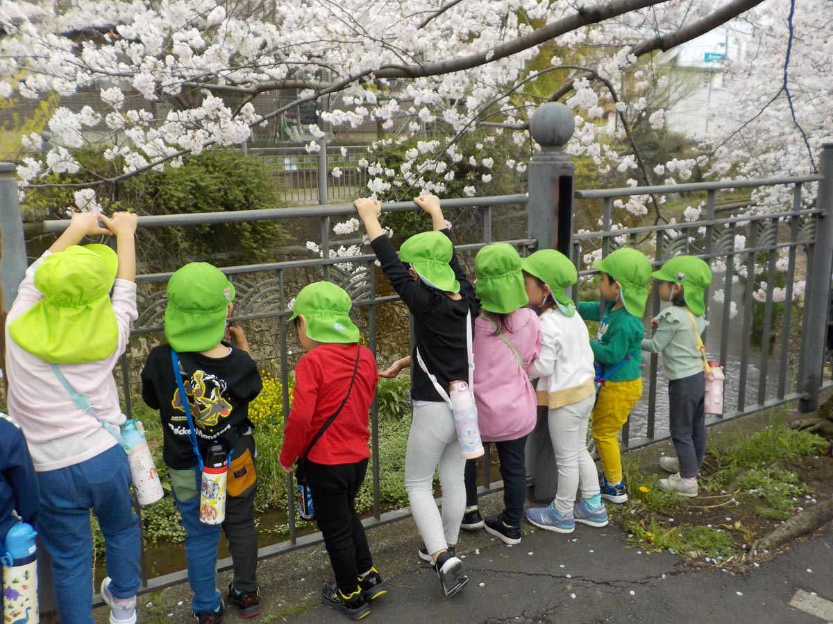 桜が大好きなこやぎ組の子ども達は、「〇〇で桜見たの♪」とお休みの日に見た桜のお話もたくさんしてくれるので、川沿いへ見に行きました🌸