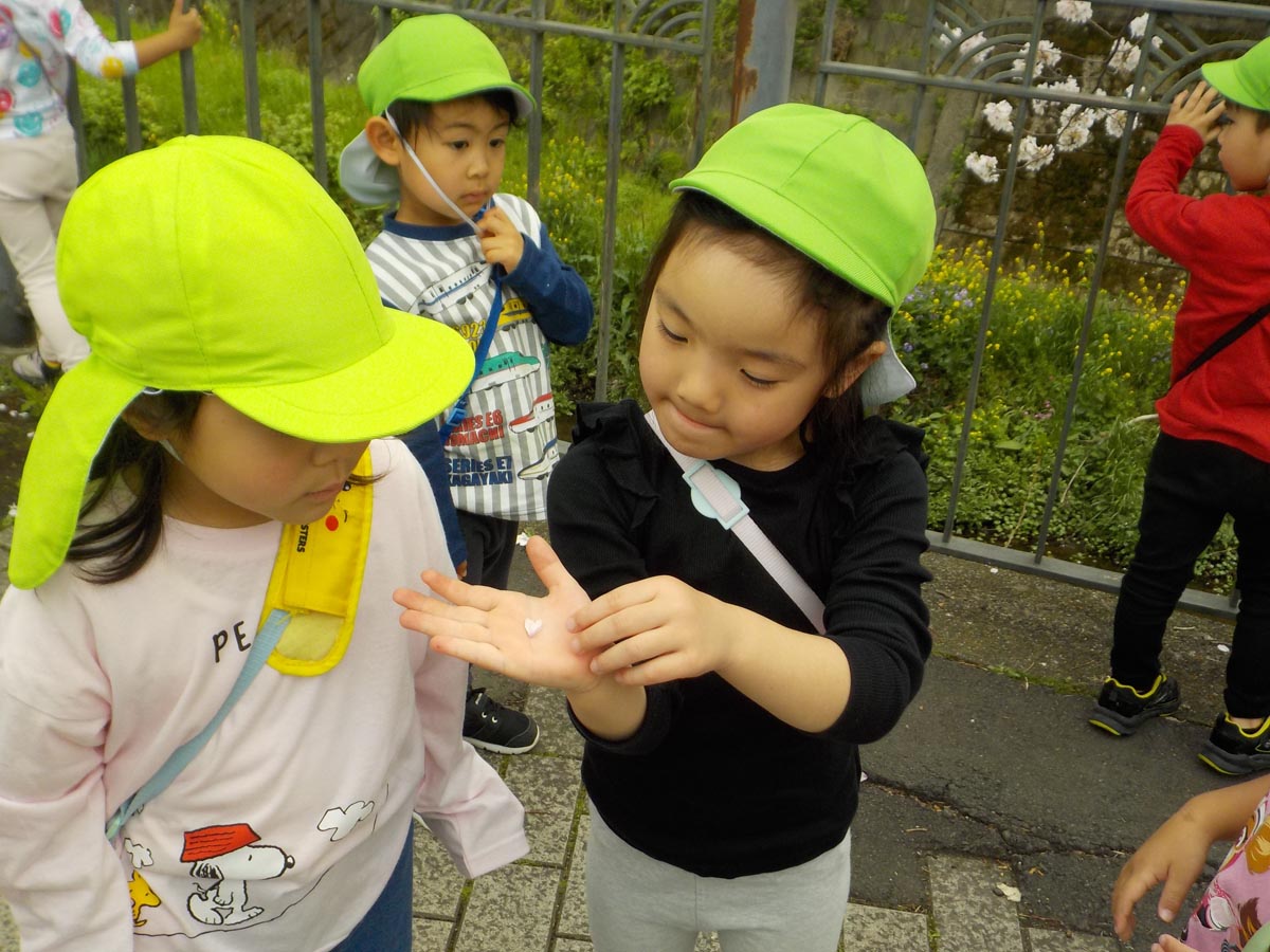 「きれい~」や「ハートの形!」とすごく楽しそうに眺め、「桜持って帰りたい…」との声があったので舞ってきた桜を拾ってお土産にしました♬