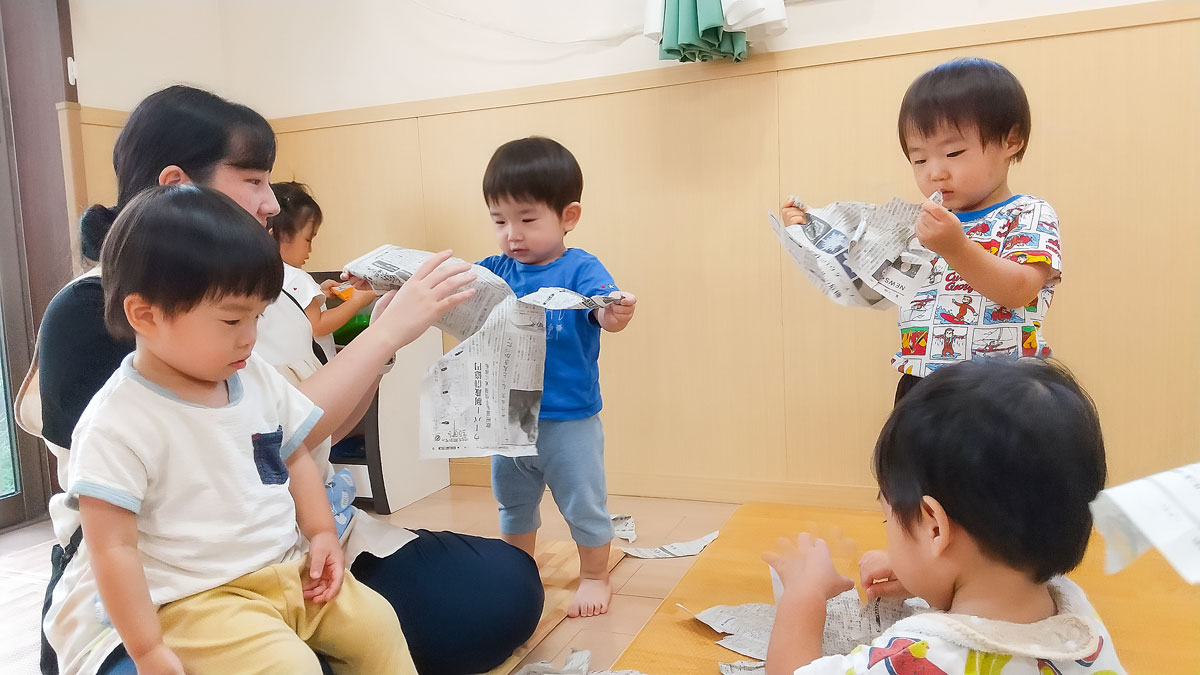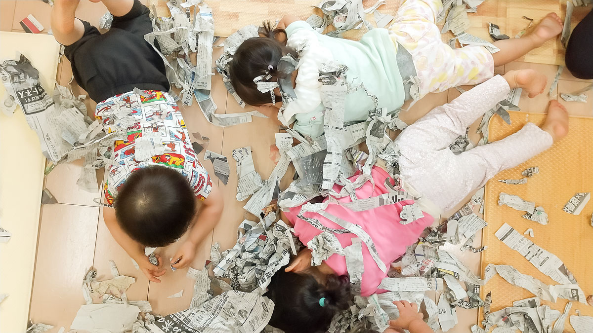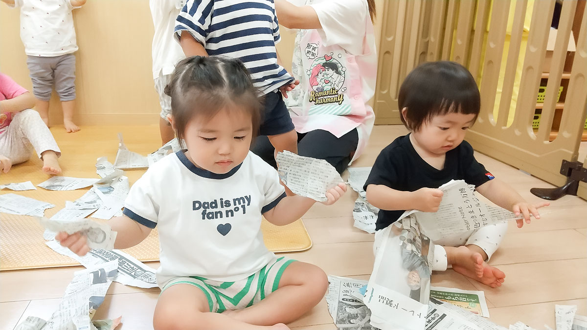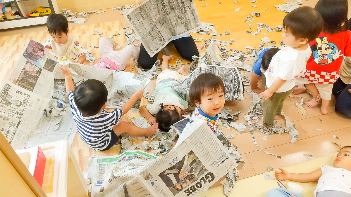 新聞紙をビリビリ破ったり、丸めたり、布団にしてかけてみたり洋服にしてみたり。新聞紙を海に見立てて泳いだりもしました🌊 以前は保育士と一緒に遊ぶことが楽しかったのですが、少しずつ友だちと一緒に遊ぶことが楽しくなってきているので、真似っこをして遊ぶ姿がたくさん見られました。寝たふりをする姿も可愛らしかったです!