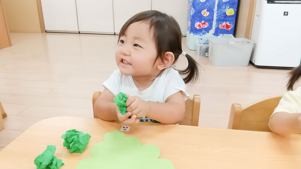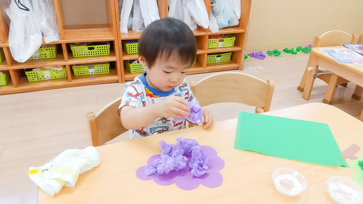 画用紙を見せながら「紫と黄緑のぶどうどっちがいい?」と聞くと、好きな色を選んでいました。お花紙を丸めてお団子をたくさん作りました。最初は丸めることがわからない様子もありましたが、一緒に作っていくうちにギュッと丸めることが面白くなった子どもたち。丸めたお団子にボンドを付けてペタリ! ぶどうが完成すると嬉しそうでした。美味しそうに食べる真似が可愛らしかったです😊