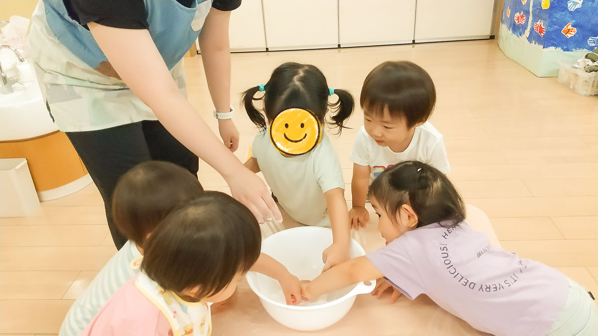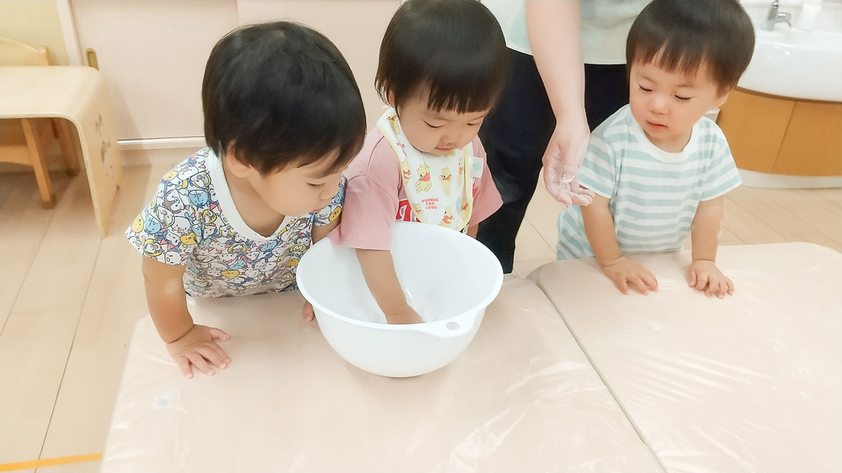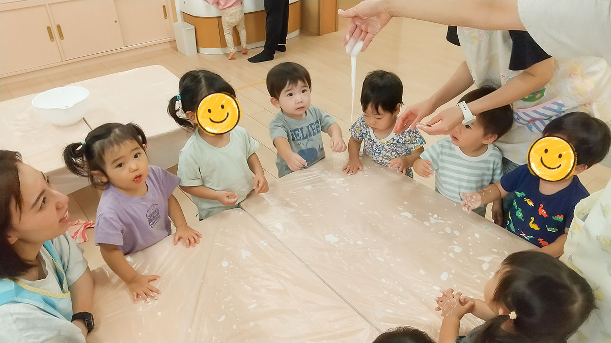 ボールに入った片栗粉を見せ、「触っていいよー」と声をかけると、そーっと指を入れていた子どもたち。サラサラの感触に「これは何だろう?」と不思議そうな表情をしていました。水を入れると固くなったりドロドロになったり、形が変わっていくことを楽しんでいました。机の上にポタポタ垂らしてみたり、塗りたくってみたり、ひんやりとした感触を楽しんでいる姿が見られました。