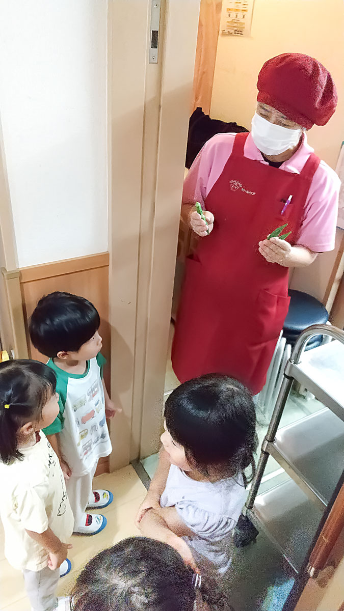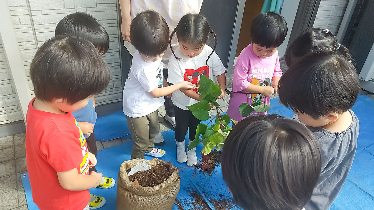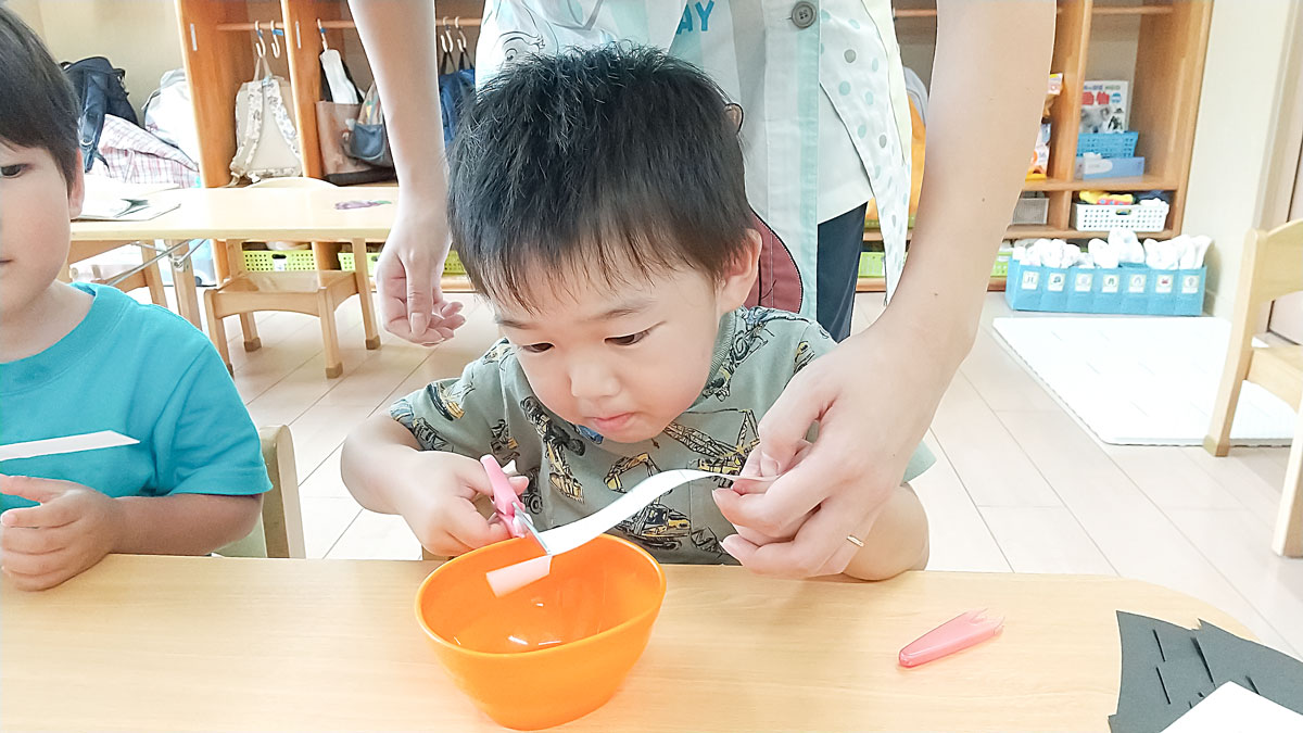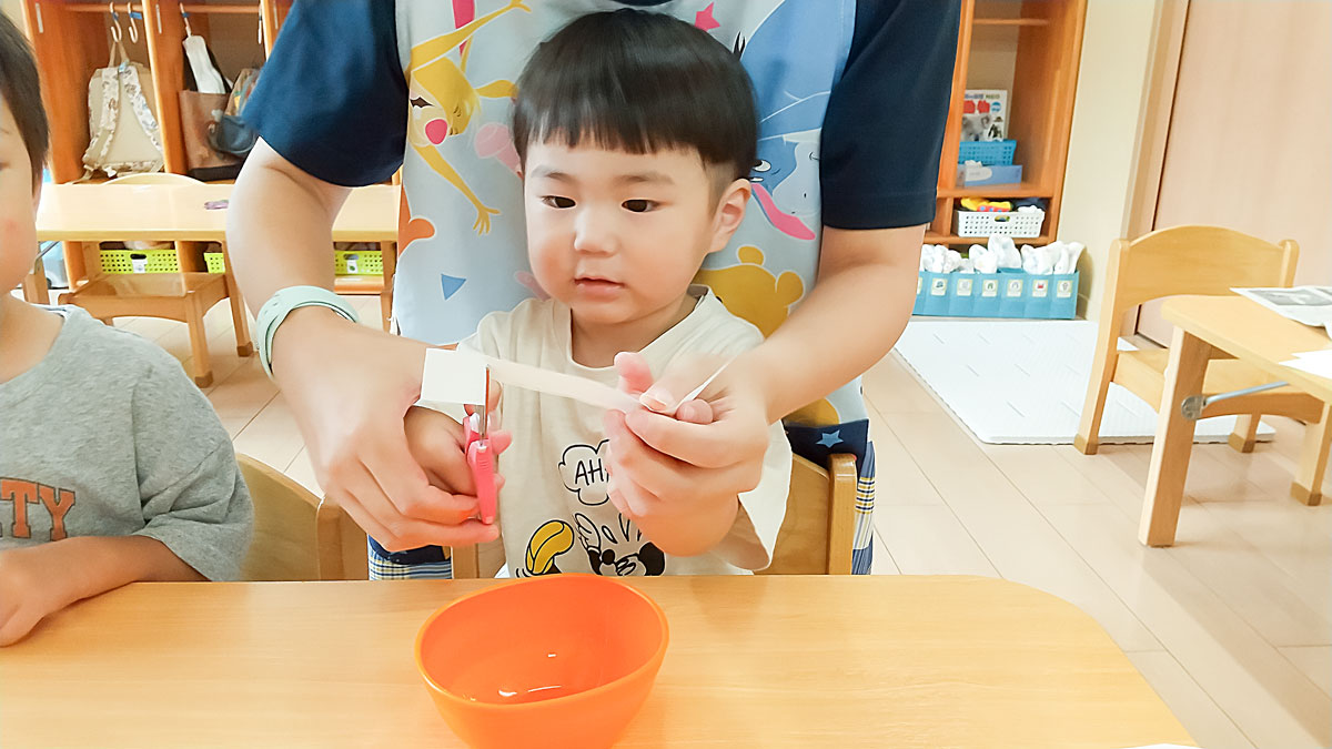 はじめは保育者と一緒に持っていましたが、今では1人で切ることができるようになってきたお友だちも増えてきました✨