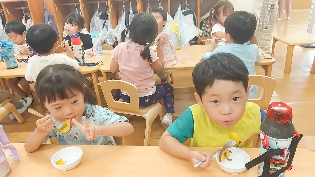 サツマイモは給食前にお芋のバター焼きにして食べ、「甘いね」「おいしいね」とほっこり笑顔のこあら組さんでした😊🍠💛
