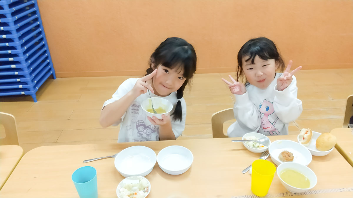 パンに自分で食材を挟みハンバーガーにして食べました!中には「トマトだけバーガーにしよ」「ぜんぶバーガーでしょ」とアレンジをしてお友だちと楽しく食べる姿も。デザートはプリンにリンゴやウエハース、ホイップなどをトッピングしてプリンアラモードにして食べました。