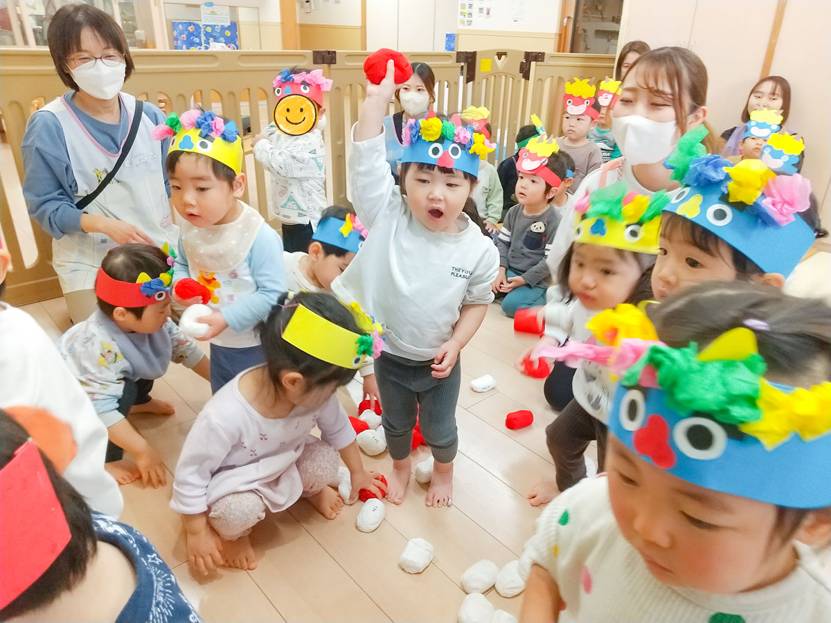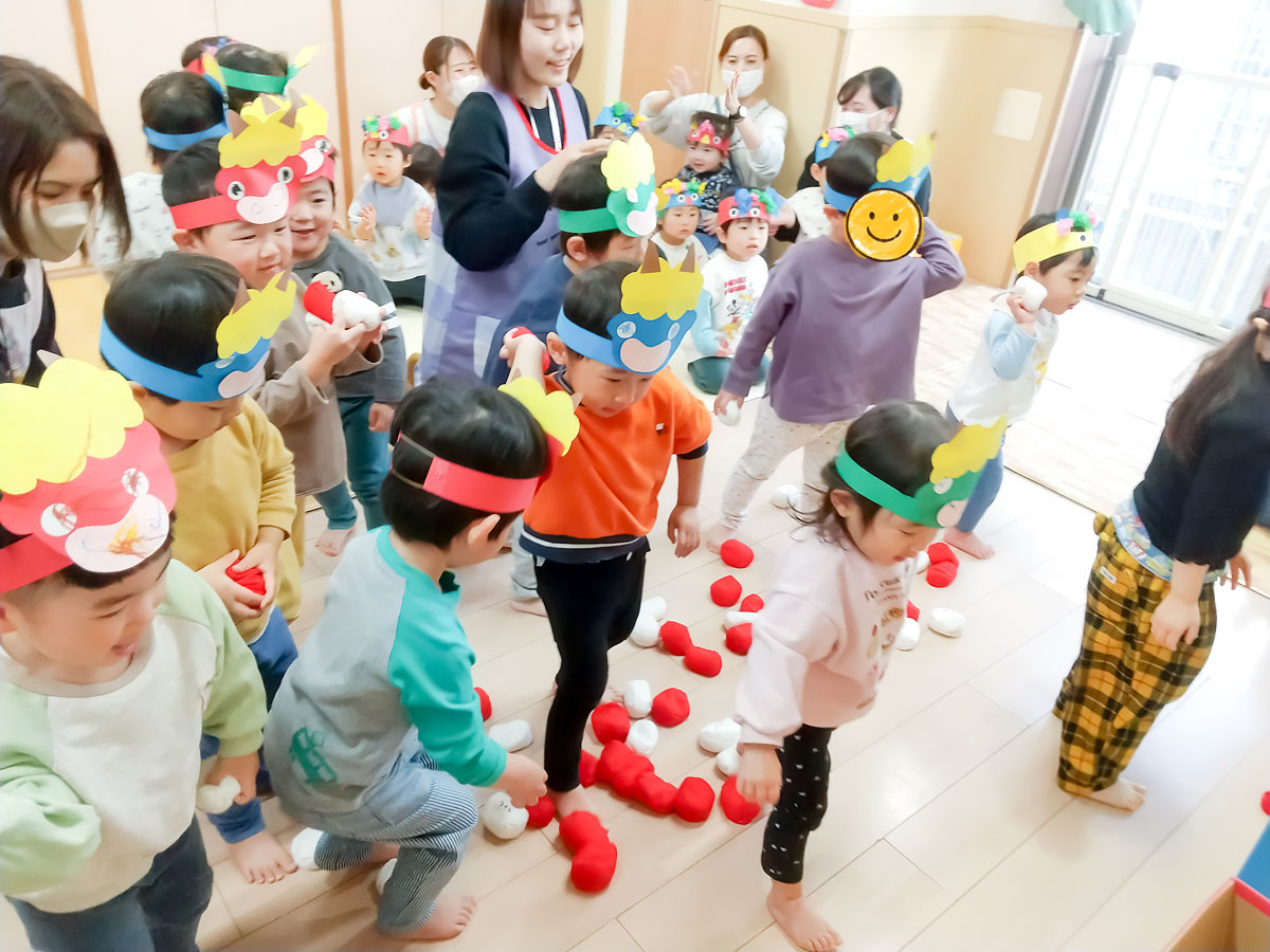 紅白玉を使って鬼退治ゲームをして、大きな声で「豆まきの歌」を歌いました♪