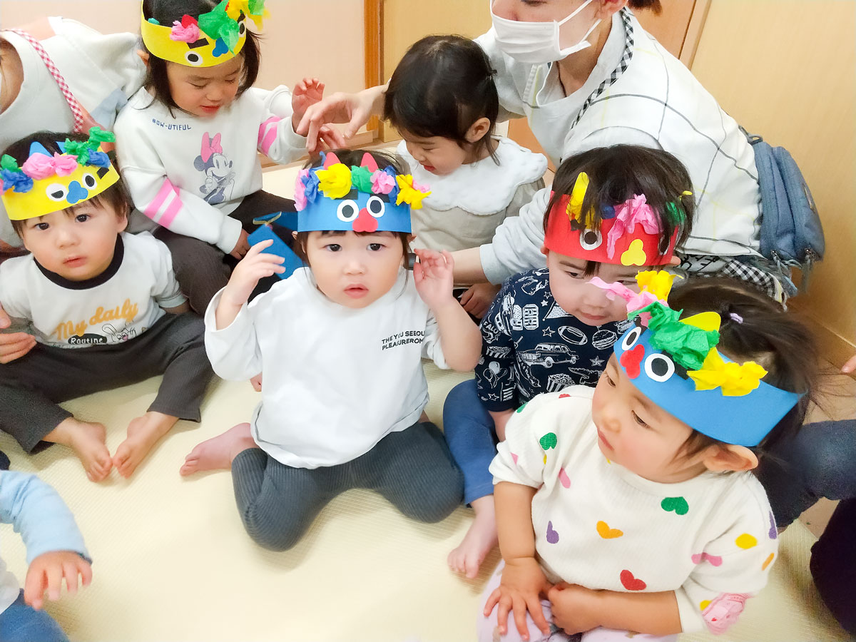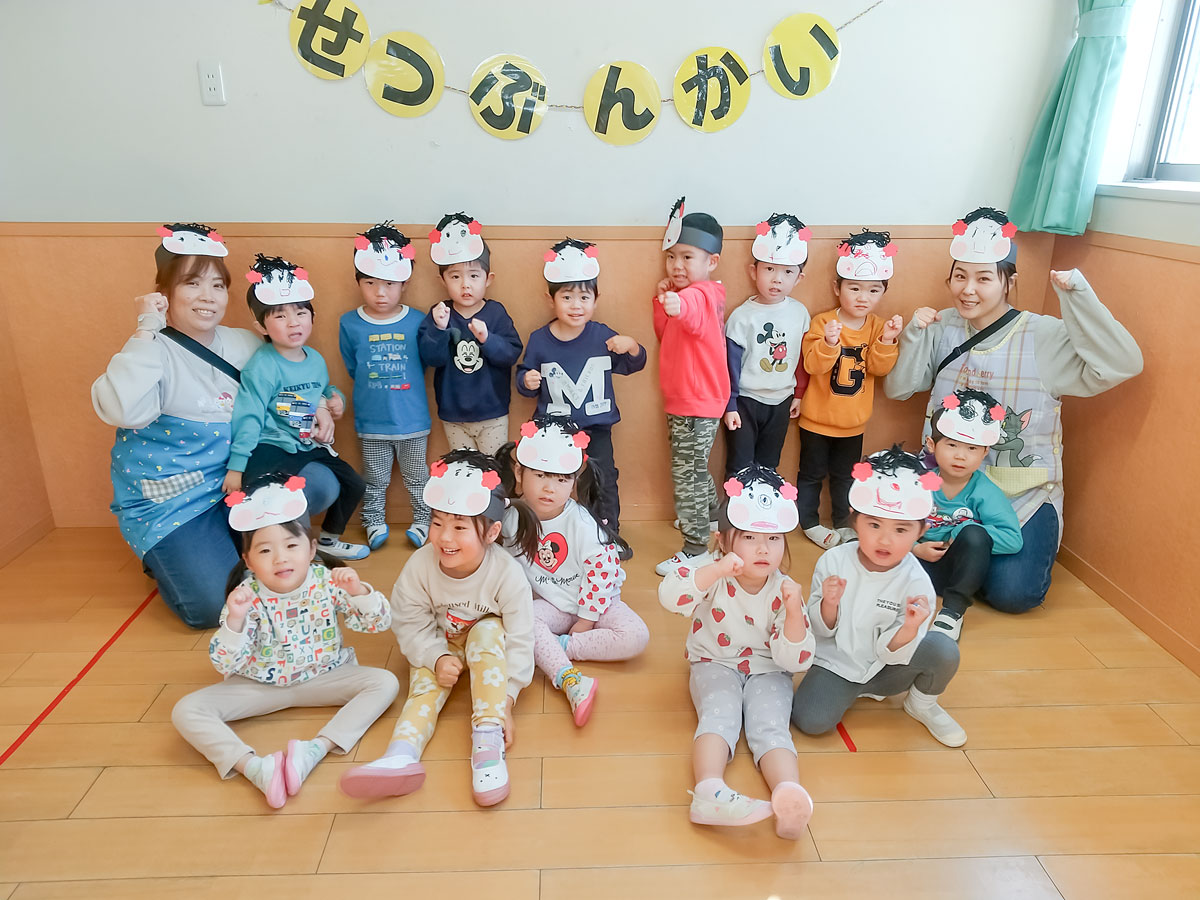 「鬼来るかな?」「鬼に会いたい!倒してやるっ!!」と、意気込んでいた子どもたち。節分会がはじまるとソワソワしはじめ、辺りを見回している姿に思わず笑ってしまいました☺