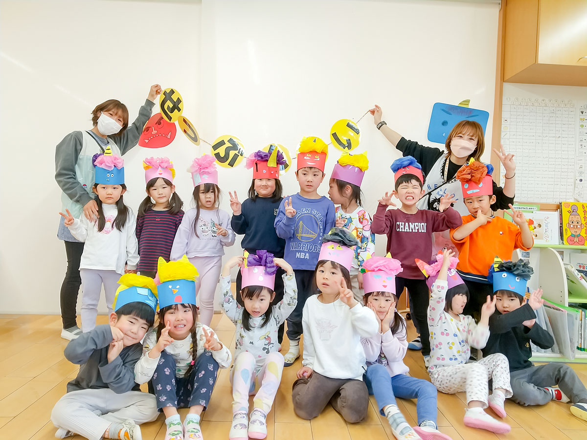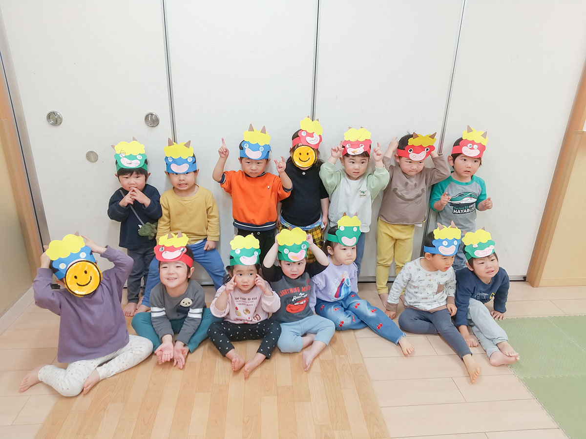 かわいらしい鬼のお面を作り、「豆まきの歌」が好きになって、楽しんでいた子どもたち。