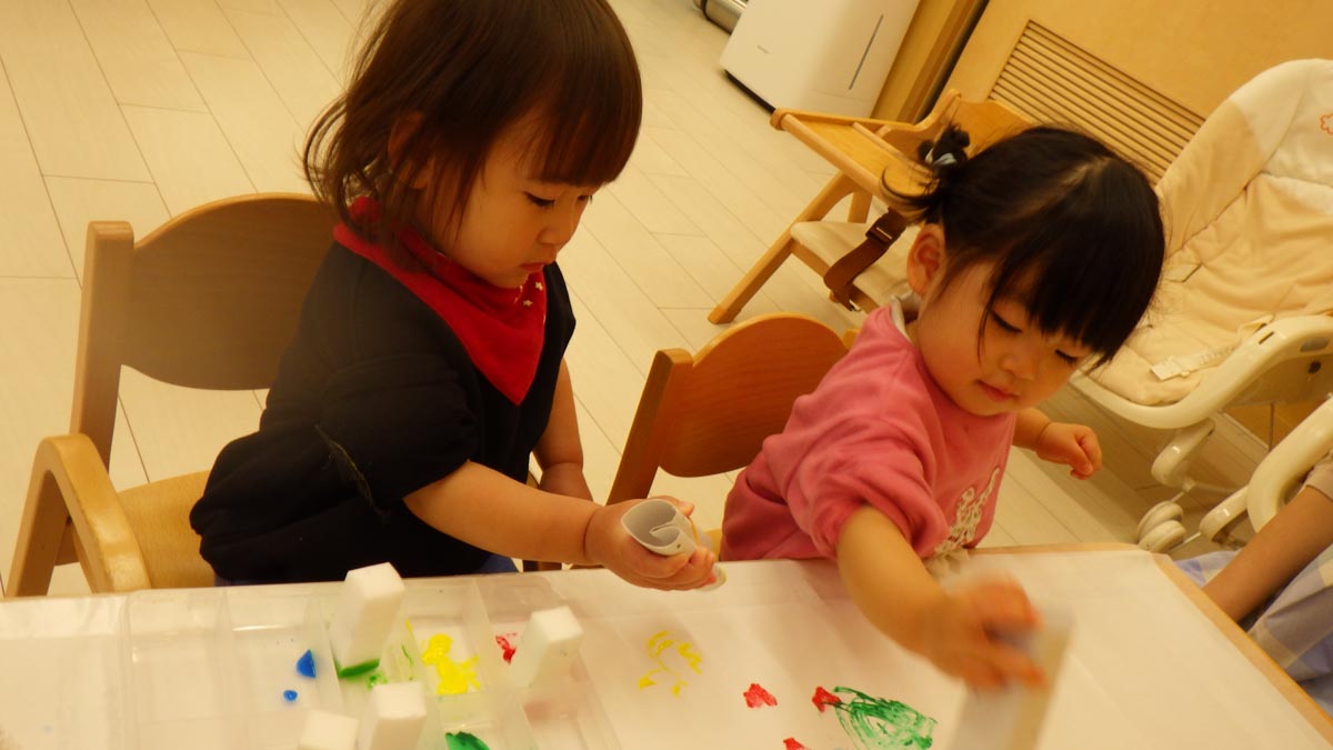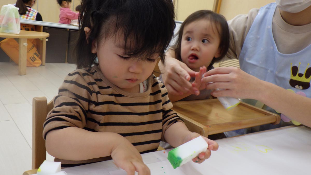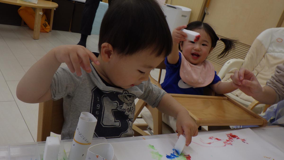 絵の具遊びを楽しみました♪大きな白い紙に色々な形のスタンプでポンポンスタンプを押してみたり、少し手に絵の具が付くと「えへへ~♪」とニコニコ笑顔のひよこ組さんです😊