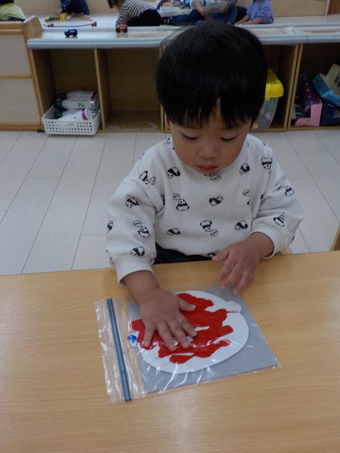 赤にする?青にする?と聞くと、それぞれ自分の好きな色を教えてくれたうさぎ組さん。そして絵の具を袋越しにぬりぬり……🎨