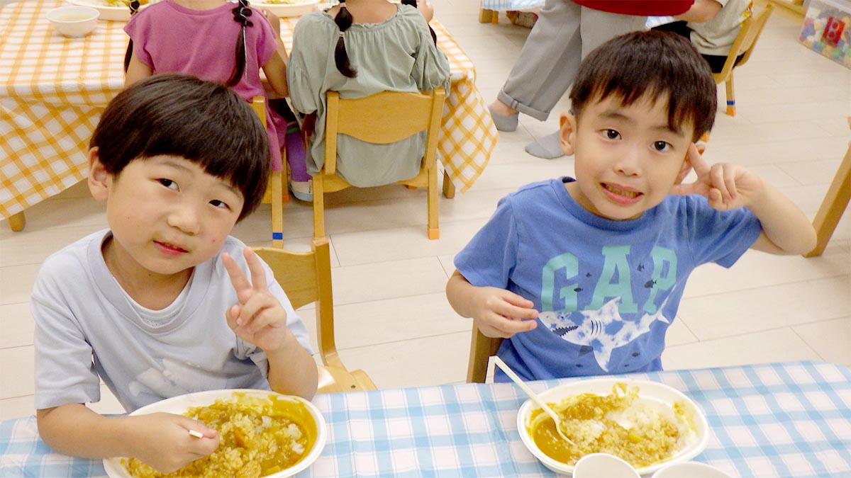 夕飯はテーブルクロスがかかったテーブルを見つけると、普段と違った雰囲気で自分たちが作ったカレーとゼリーを食べ、子どもたちも「美味しい☺」とニコニコのこぐま組さんです♬