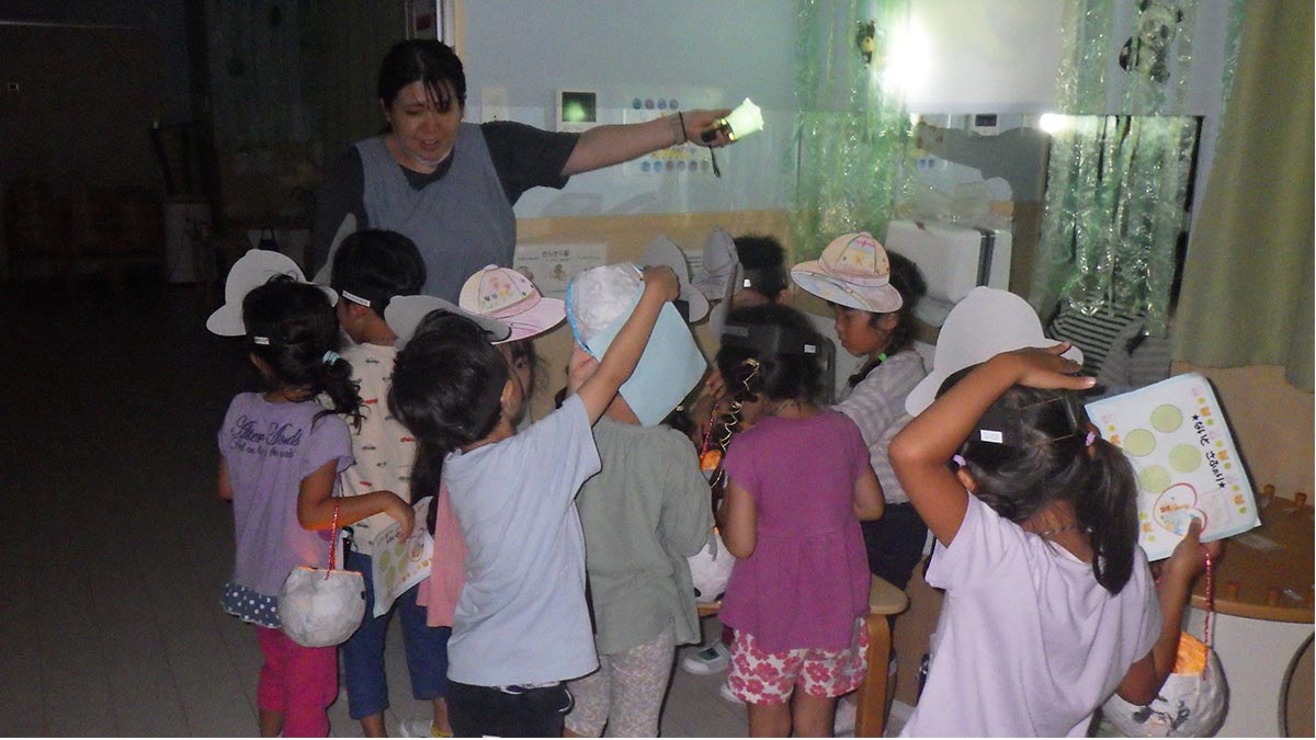 夜はいつも使っている室内がジャングルになり、宝探しでもらった双眼鏡と帽子を身に付け、事前に作ったランタンを持ちナイトサファリがスタート! 各箇所に懐中電灯が置いてあり、それを壁に向けて明かりを点けると、なんと動物が!!楽しいと思った子ども達は何度も懐中電灯を灯していました☆彡