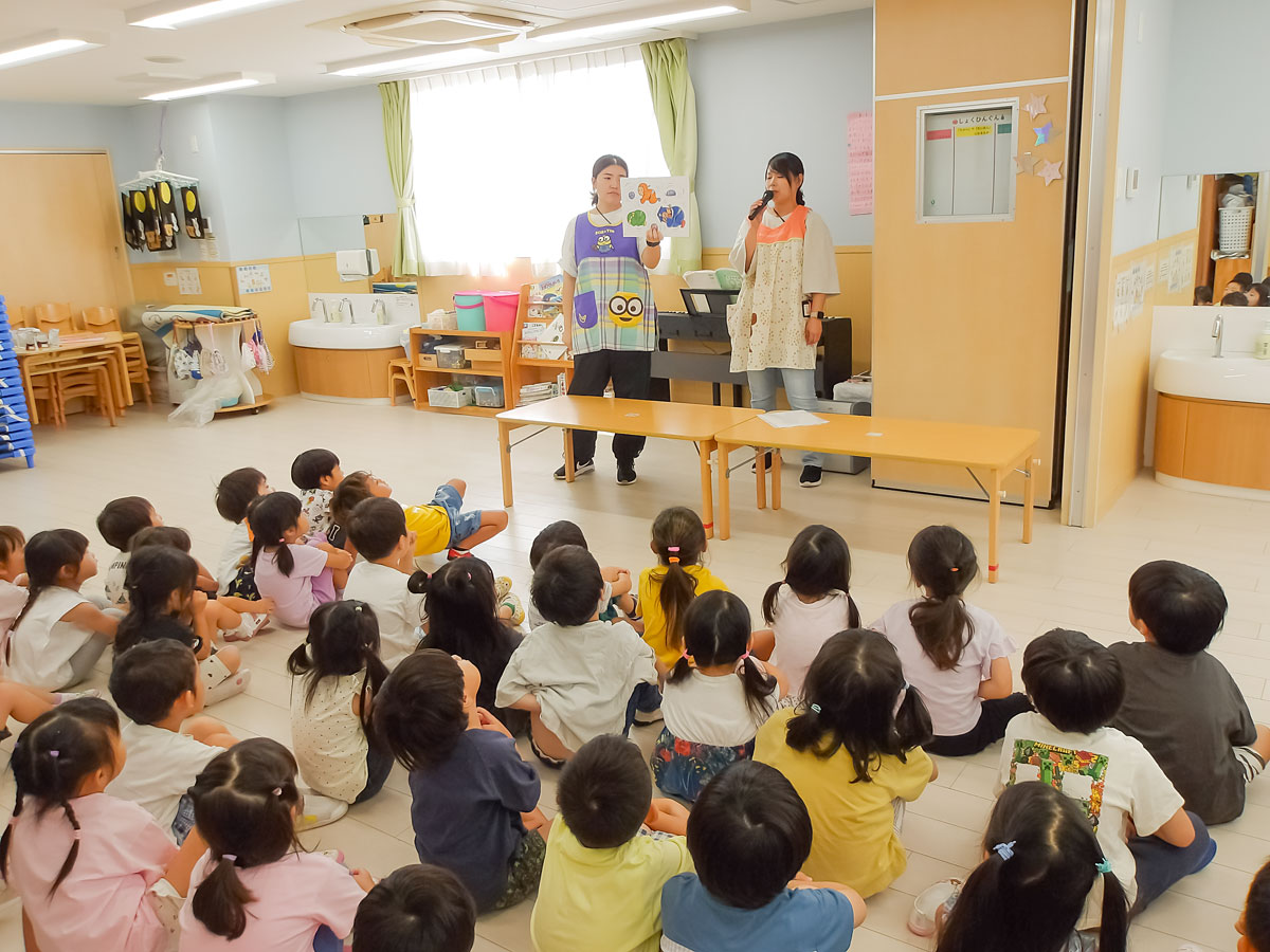 まず、午前中は3歳児、4歳児、5歳児が集まり、「防災とはなんだろう?」という保育者の話に耳を傾け、自分の考えたことをみんなに聴いてもらう時間となりました。