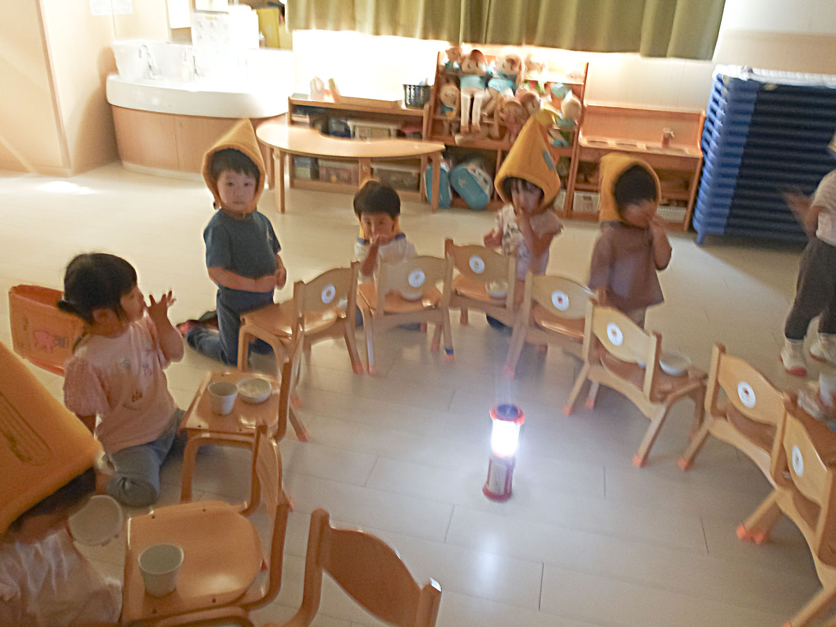 電気も停まってしまった想定で、ランタンが灯る保育室の中、午前中に学んだアルファ米をおにぎりにして食べました。