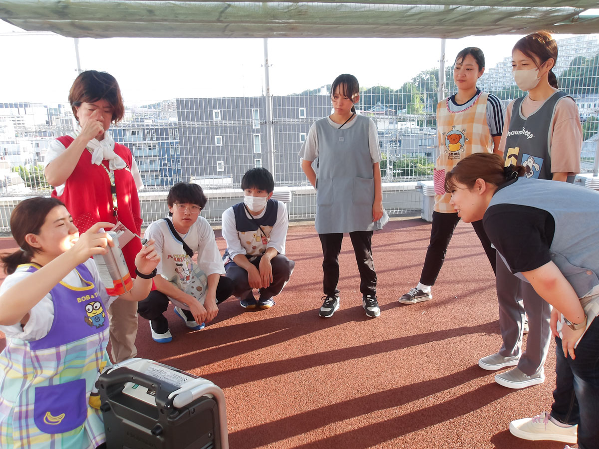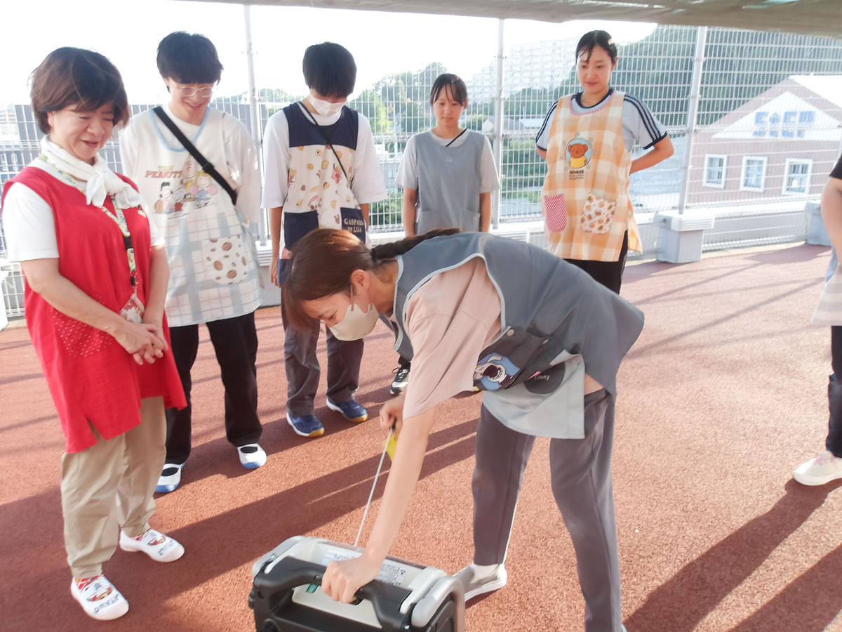 防災の日ということで、保育者も「もしも」の時に備えて発電機の使い方を学び、実際に稼働させてみることを体験しました。