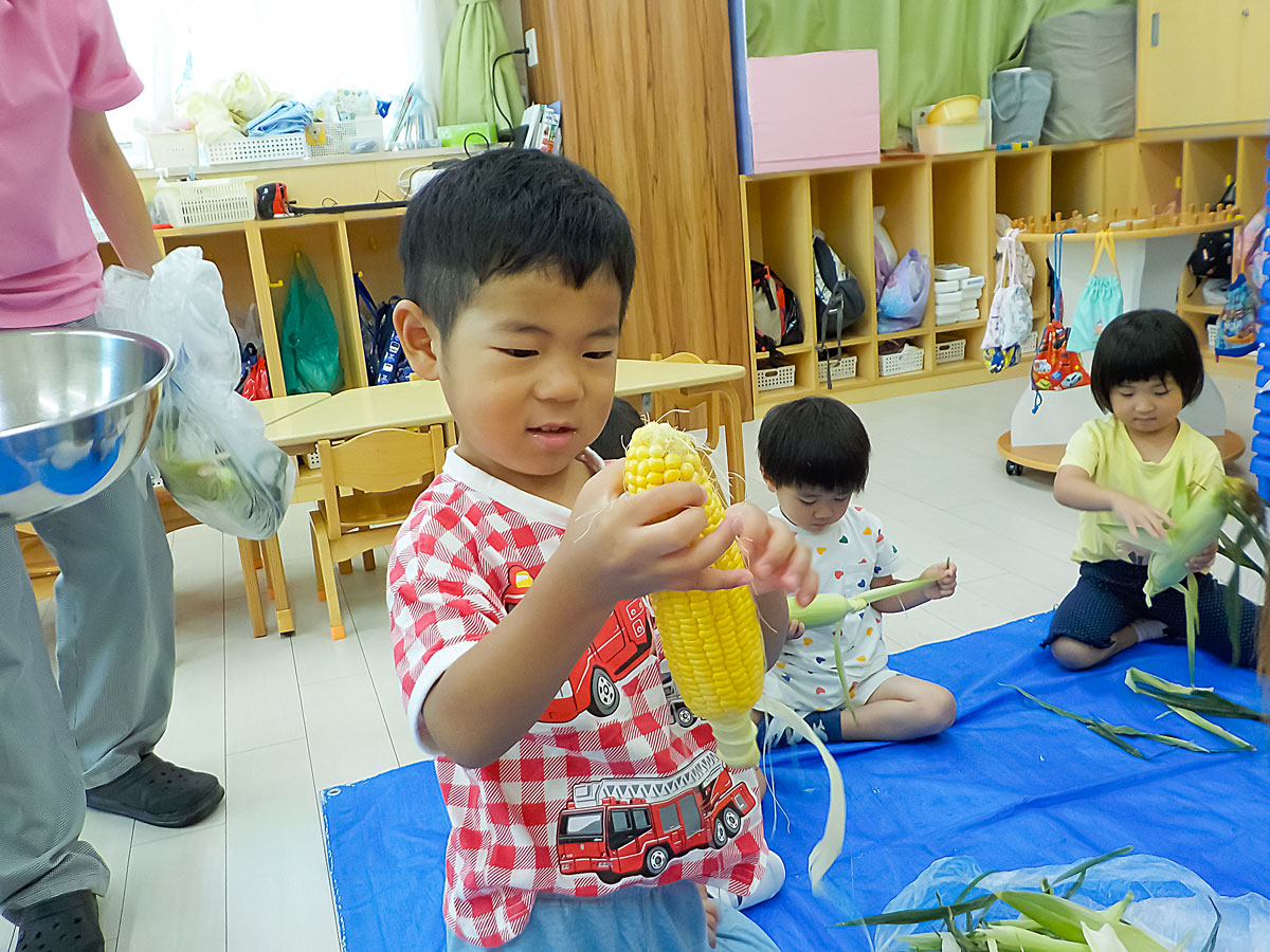 自分たちが皮をむいたとうもろこしがおやつに出てくると「これ皮剝いたやつだ!」「いいにおいがするね!」と嬉しそうな表情を見せてくれました♪