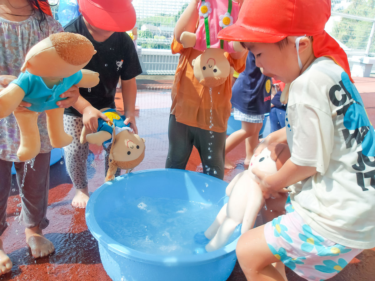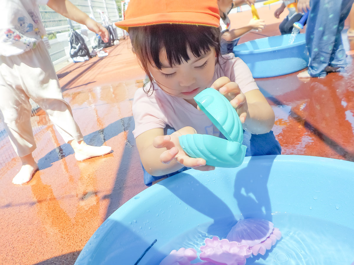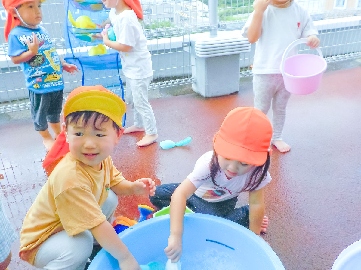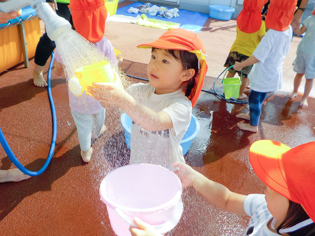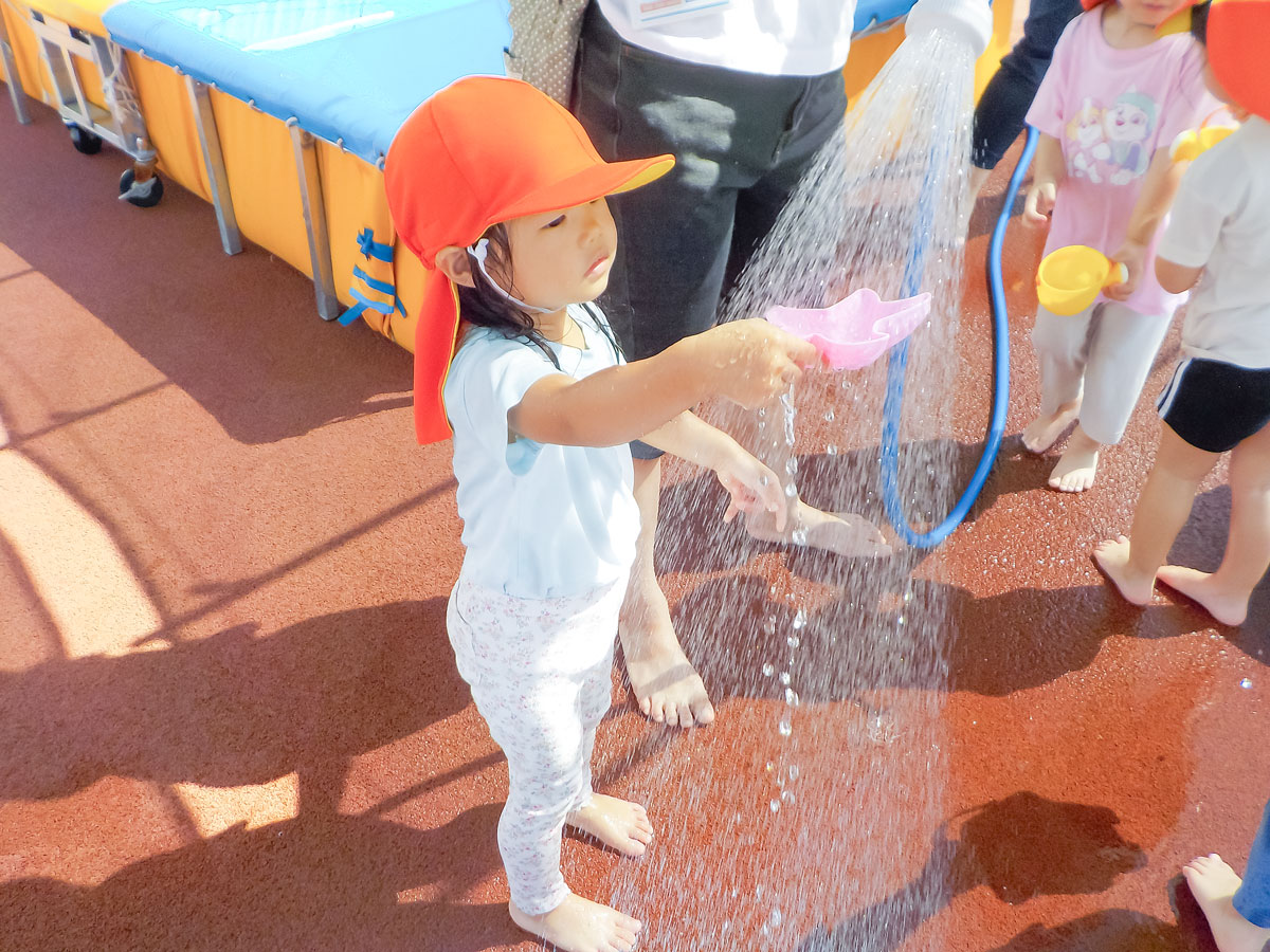 お友だちと一緒に水溜まりの上をパシャパシャと跳ねたり、ダイナミックにシャワーのトンネルをくぐったり…玩具のバケツやジョウロに水を汲んで保育者の足に掛けてくれたりと一人ひとり楽しむ姿が見られていました。