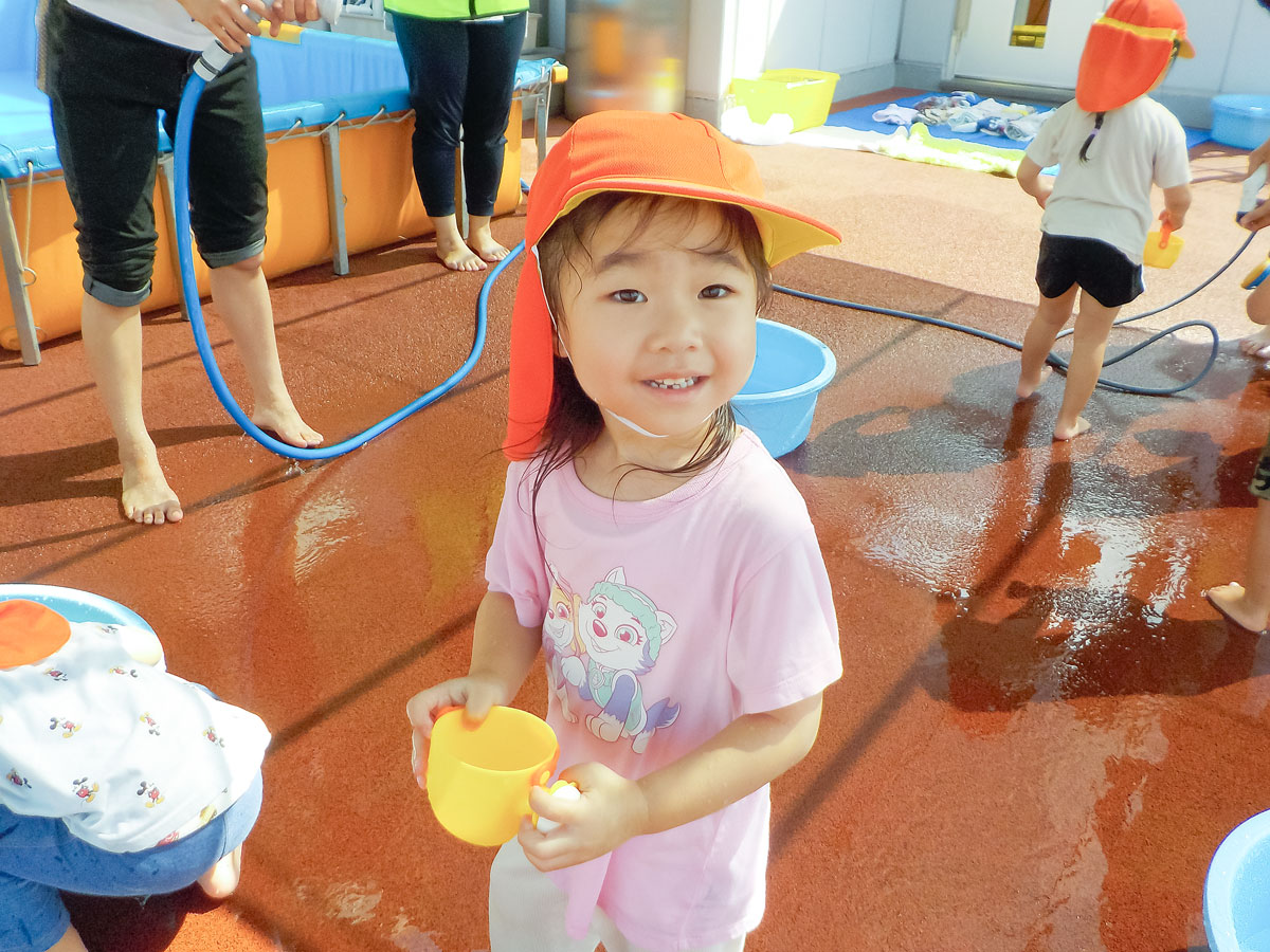 保育者が「今日は水遊びできるよ!」と、声をかけると目をキラキラ輝かせて「やったー!!」と大喜びするくらい、水遊びが大好きな りす組さん✨