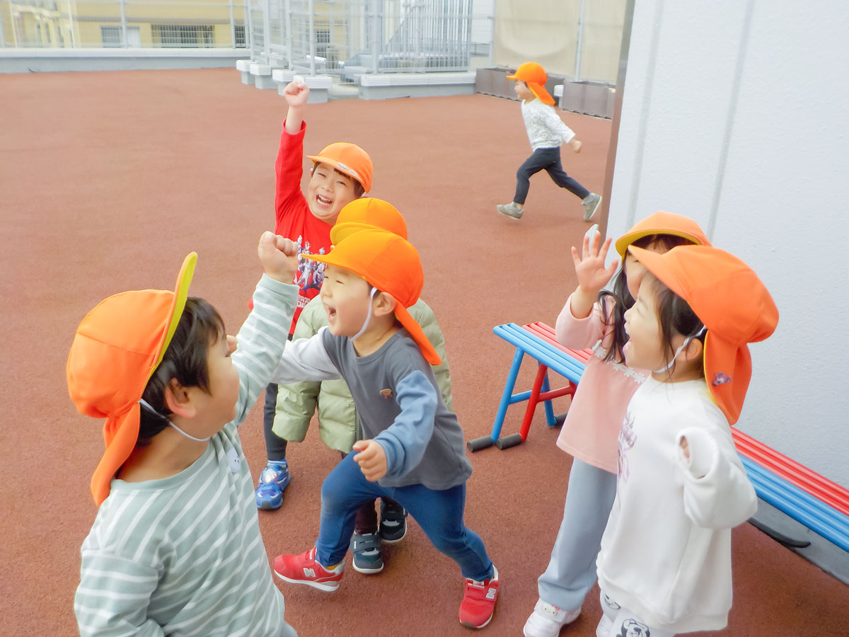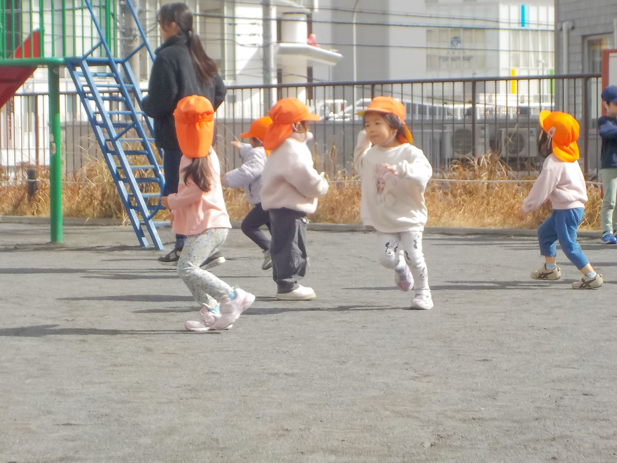 友だちの手を引いて遊びに誘ったり、お医者さんごっこや、なりきり追いかけっこ(恐竜や警察になって追いかける)をしたりして、楽しむ姿が見られます♪