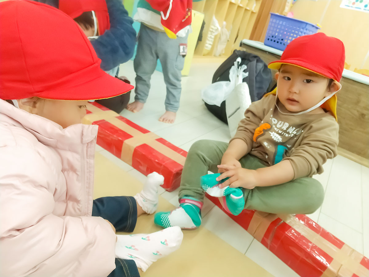 お散歩の準備が始まると、誰と手をつなごうかワクワクしはじめる子どもたち。