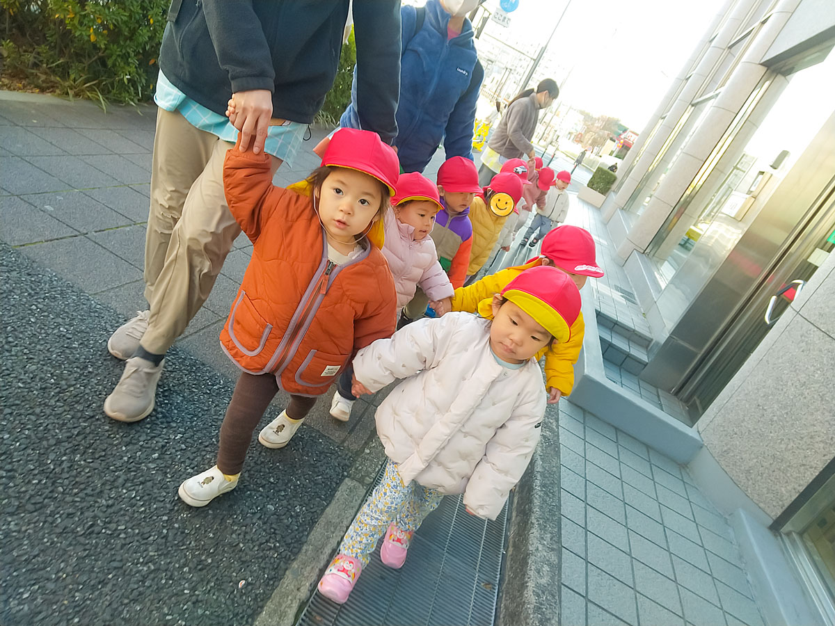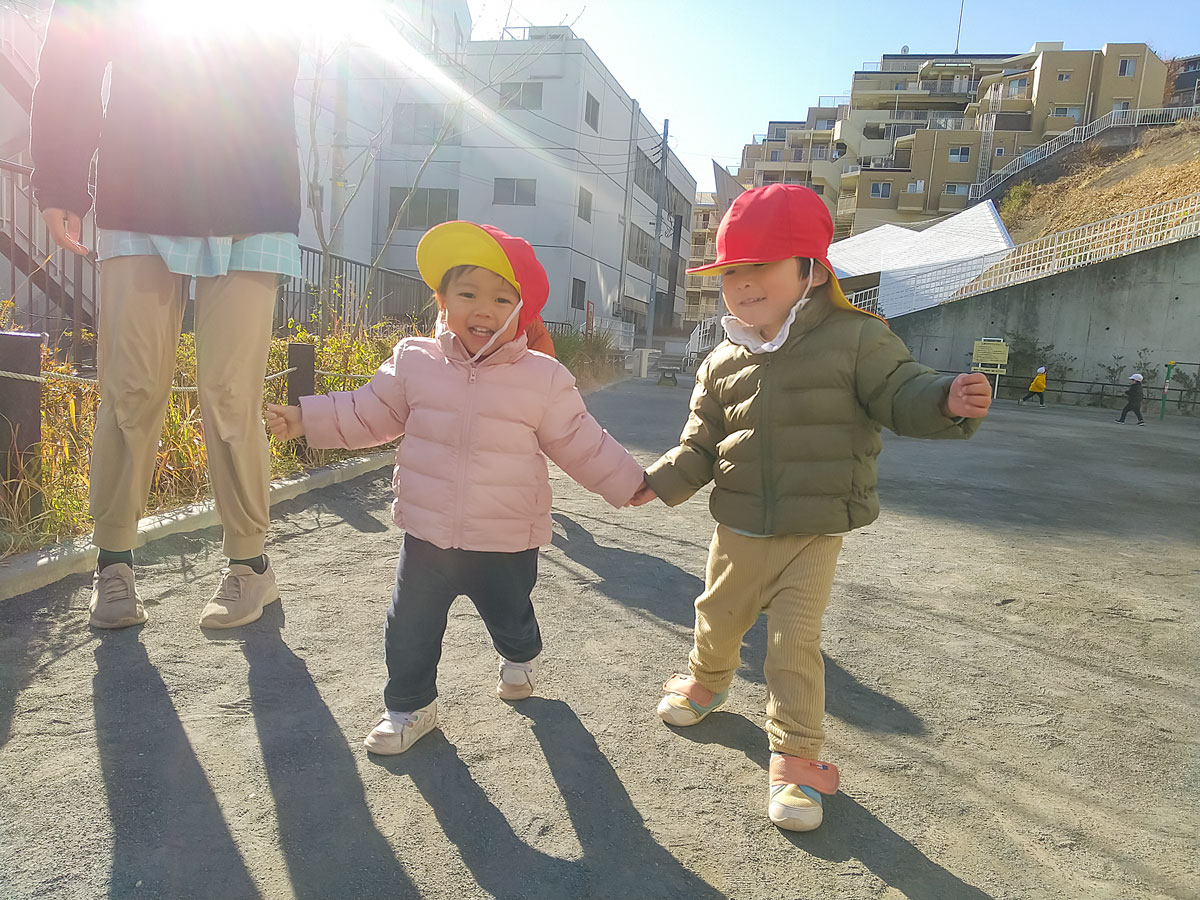「〇〇ちゃん、一緒に てー つなご」「いいよ」と、可愛い会話が飛び交います。